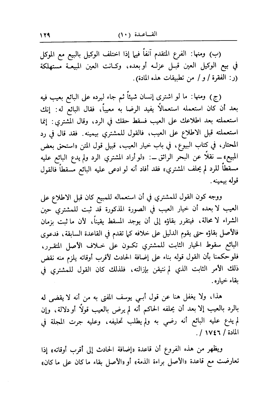 (ج) وَمِنْهَا: مَا لَو اشْترى إِنْسَان شَيْئا ثمَّ جَاءَ ليَرُدهُ على البَائِع بِعَيْب فِيهِ بعد أَن كَانَ اسْتَعْملهُ اسْتِعْمَالا يُفِيد الرِّضَا بِهِ معيبا، فَقَالَ البَائِع لَهُ: إِنَّك استعملته بعد اطلاعك على الْعَيْب فَسقط حَقك فِي الرَّد، وَقَالَ المُشْتَرِي: إِنَّمَا استعملته قبل الِاطِّلَاع على الْعَيْب، فَالْقَوْل للْمُشْتَرِي بِيَمِينِهِ. فقد قَالَ فِي رد الْمُحْتَار، فِي كتاب الْبيُوع، فِي بَاب خِيَار الْعَيْب، قبيل قَول الْمَتْن " اسْتحق بعض الْمَبِيع " - نقلا عَن الْبَحْر الرَّائِق -: " لَو أَرَادَ المُشْتَرِي الرَّد وَلم يدع البَائِع عَلَيْهِ مسْقطًا للرَّدّ لم يحلف المُشْتَرِي " فقد أَفَادَ أَنه لَو ادّعى عَلَيْهِ البَائِع مسْقطًا فَالْقَوْل قَوْله بِيَمِينِهِ.