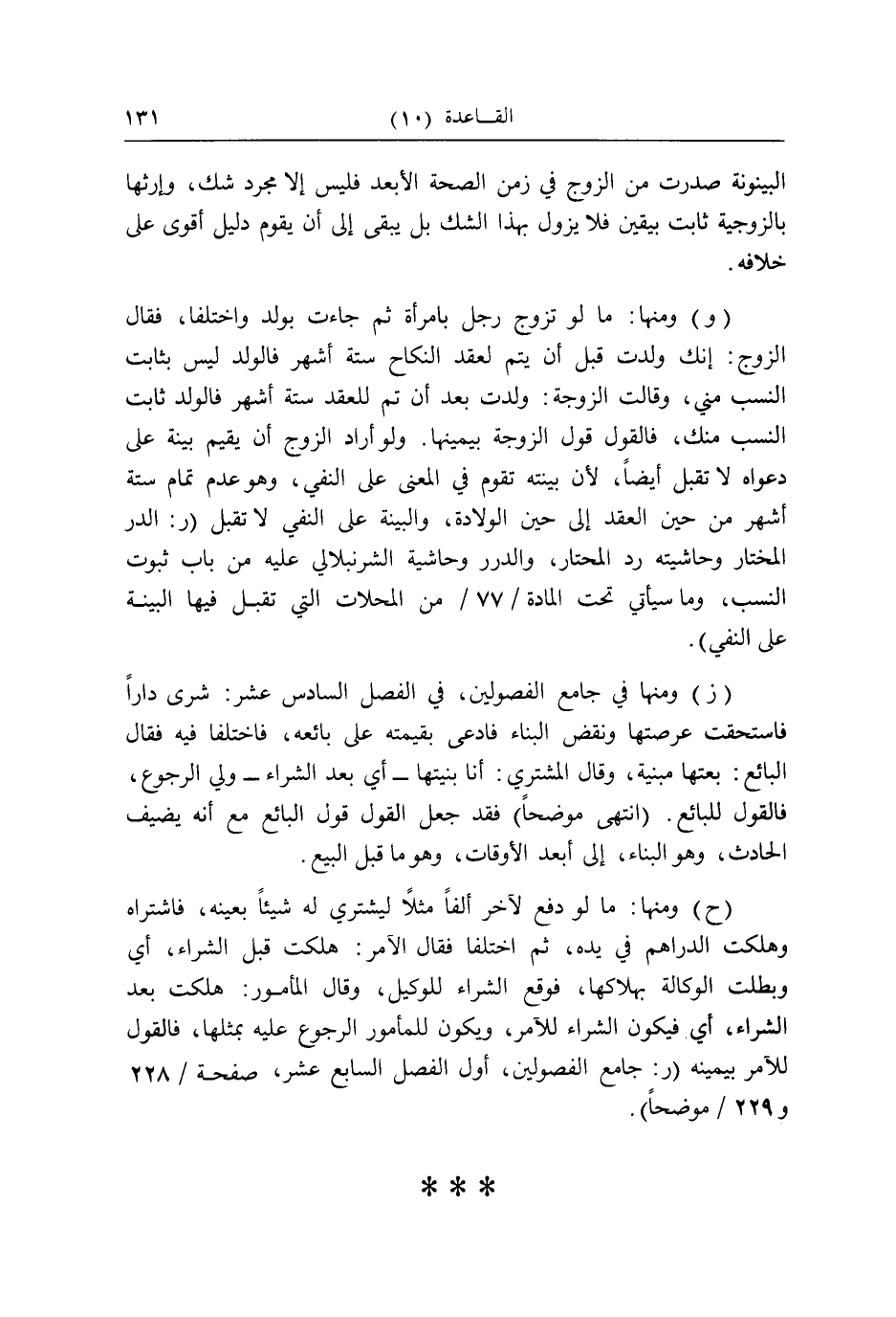(ز) وَمِنْهَا فِي جَامع الْفُصُولَيْنِ، فِي الْفَصْل السَّادِس عشر: شرى دَارا فاستحقت عرصتها وَنقض الْبناء فَادّعى بِقِيمَتِه على بَائِعه، فاختلفا فِيهِ فَقَالَ البَائِع: بعتها مَبْنِيَّة، وَقَالَ المُشْتَرِي: أَنا بنيتها - أَي بعد الشِّرَاء - ولي الرُّجُوع، فَالْقَوْل للْبَائِع. (انْتهى موضحاً) فقد جعل القَوْل قَول البَائِع مَعَ أَنه يضيف الْحَادِث، وَهُوَ الْبناء، إِلَى أبعد الْأَوْقَات، وَهُوَ مَا قبل البيع.