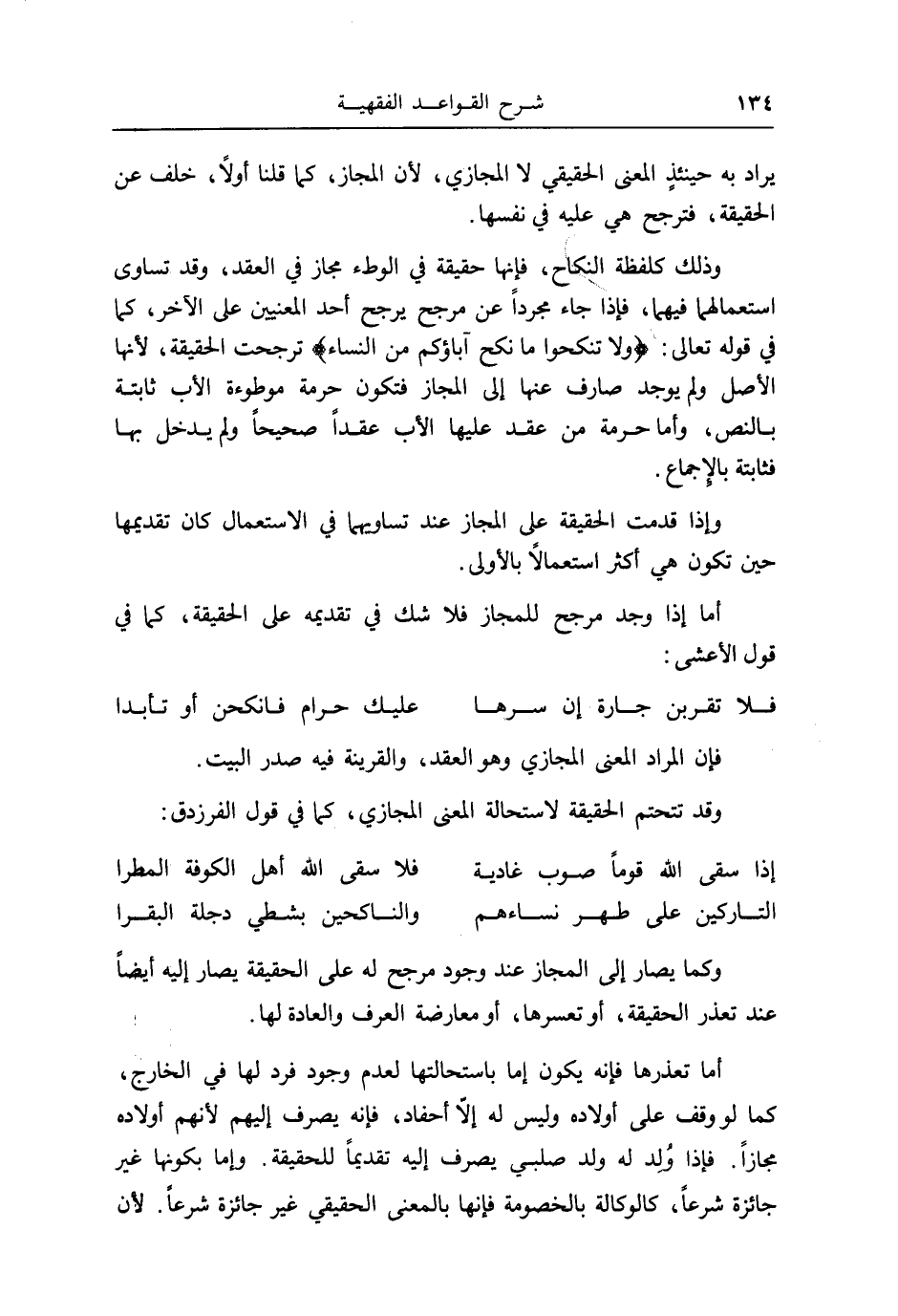 وَذَلِكَ كلفظة النِّكَاح، فَإِنَّهَا حَقِيقَة فِي الْوَطْء مجَاز فِي العقد، وَقد تساوى استعمالهما فيهمَا، فَإِذا جَاءَ مُجَردا عَن مُرَجّح يرجح أحد الْمَعْنيين على الآخر، كَمَا فِي قَوْله تَعَالَى: {وَلَا تنْكِحُوا مَا نكح آباؤكم من النِّسَاء} ترجحت الْحَقِيقَة، لِأَنَّهَا الأَصْل وَلم يُوجد صَارف عَنْهَا إِلَى الْمجَاز فَتكون حُرْمَة مَوْطُوءَة الْأَب ثَابِتَة بِالنَّصِّ، وَأما حُرْمَة من عقد عَلَيْهَا الْأَب عقدا صَحِيحا وَلم يدْخل بهَا فثابتة بِالْإِجْمَاع.