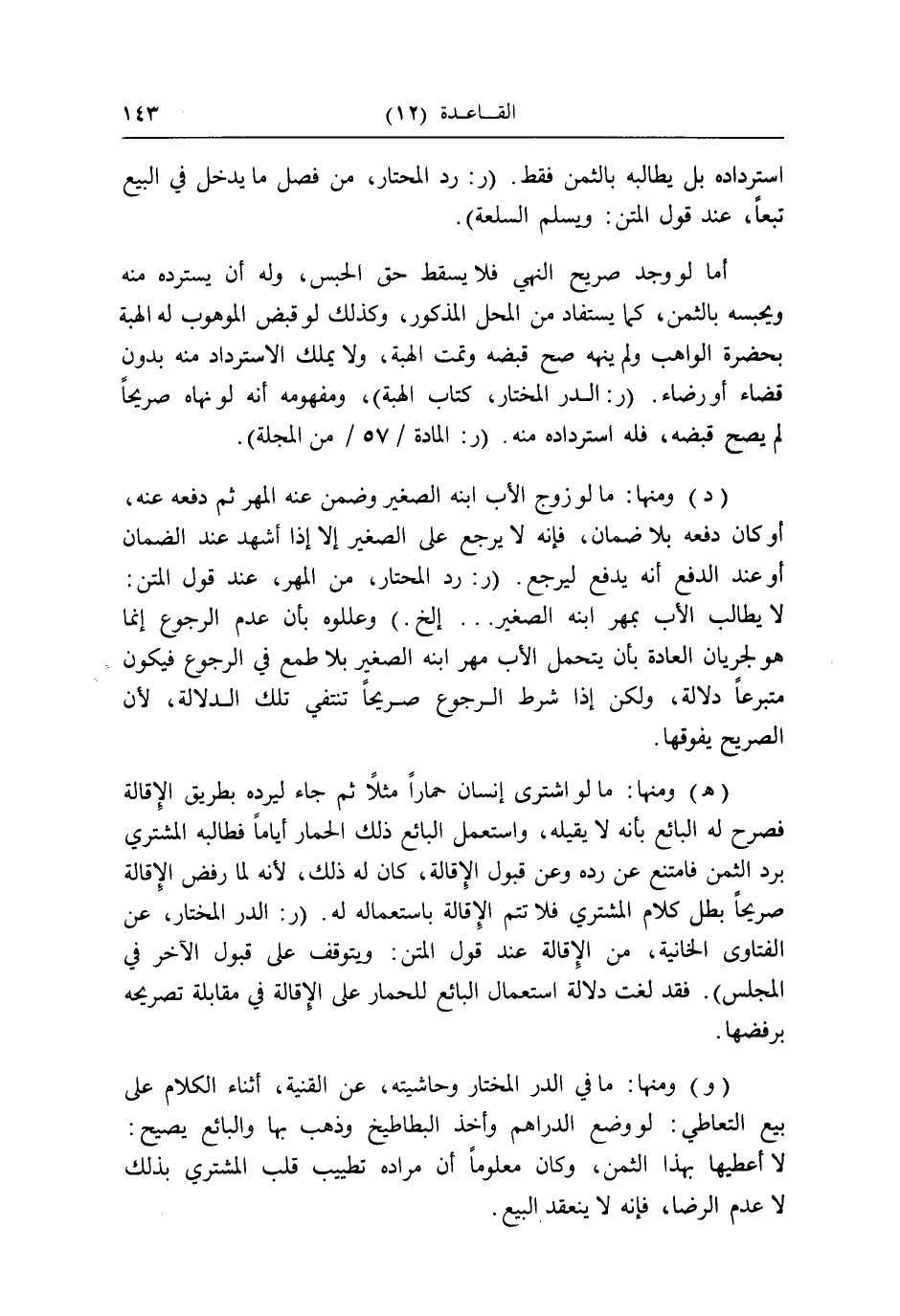 (هـ) وَمِنْهَا: مَا لَو اشْترى إِنْسَان حمارا مثلا ثمَّ جَاءَ ليَرُدهُ بطرِيق الْإِقَالَة فَصرحَ لَهُ البَائِع بِأَنَّهُ لَا يقيله، وَاسْتعْمل البَائِع ذَلِك الْحمار أَيَّامًا فطالبه المُشْتَرِي برد الثّمن فَامْتنعَ عَن رده وَعَن قبُول الْإِقَالَة، كَانَ لَهُ ذَلِك، لِأَنَّهُ لما رفض الْإِقَالَة صَرِيحًا بَطل كَلَام المُشْتَرِي فَلَا تتمّ الْإِقَالَة بِاسْتِعْمَالِهِ لَهُ. (ر: الدّرّ الْمُخْتَار، عَن الْفَتَاوَى الْخَانِية، من الْإِقَالَة عِنْد قَول الْمَتْن: ويتوقف على قبُول الآخر فِي الْمجْلس) . فقد لغت دلَالَة اسْتِعْمَال البَائِع للحمار على الْإِقَالَة فِي مُقَابلَة تصريحه برفضها.