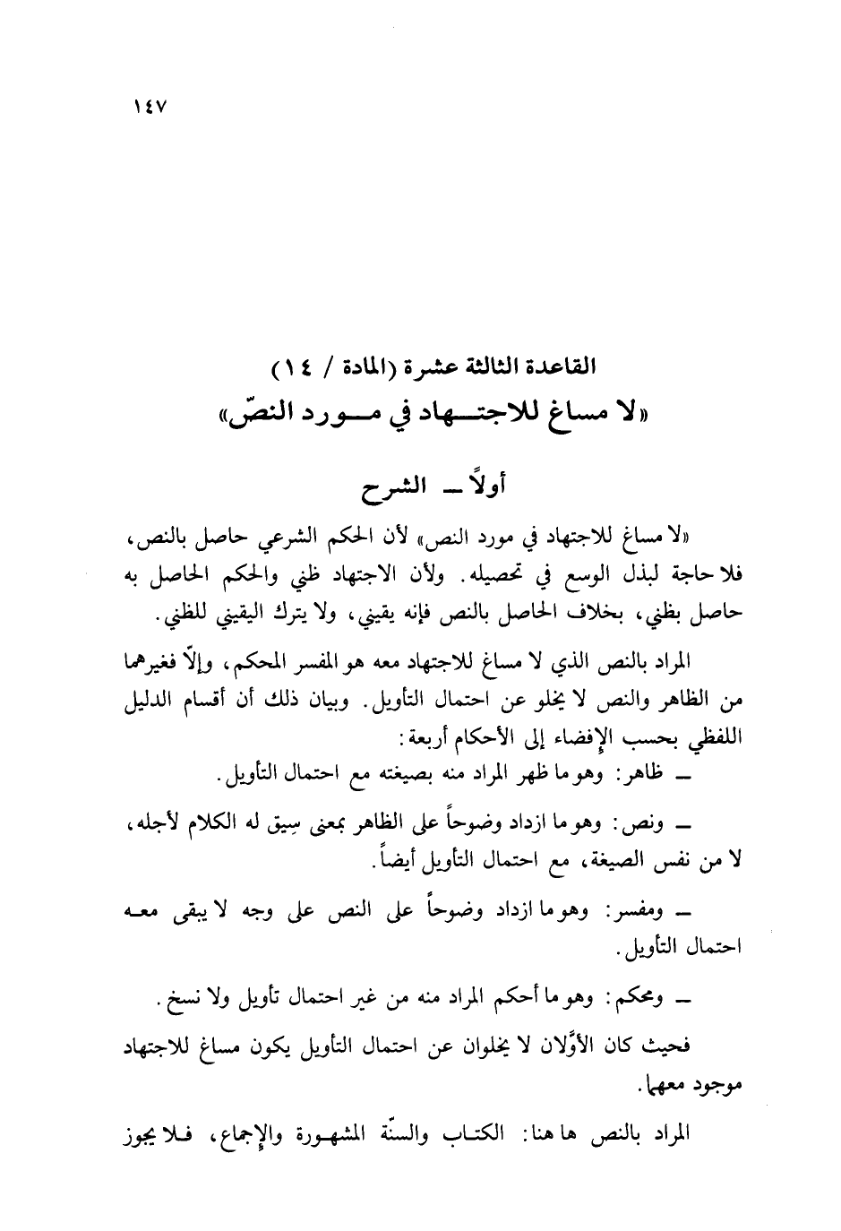المُرَاد بِالنَّصِّ الَّذِي لَا مساغ للِاجْتِهَاد مَعَه هُوَ الْمُفَسّر الْمُحكم، وَإِلَّا فغيرهما من الظَّاهِر وَالنَّص لَا يَخْلُو عَن احْتِمَال التَّأْوِيل. وَبَيَان ذَلِك أَن أَقسَام الدَّلِيل اللَّفْظِيّ بِحَسب الْإِفْضَاء إِلَى الْأَحْكَام أَرْبَعَة: - ظَاهر: وَهُوَ مَا ظهر المُرَاد مِنْهُ بصيغته مَعَ احْتِمَال التَّأْوِيل. - وَنَصّ: وَهُوَ مَا ازْدَادَ وضوحاً على الظَّاهِر بِمَعْنى سيق لَهُ الْكَلَام لأَجله، لَا من نفس الصِّيغَة، مَعَ احْتِمَال التَّأْوِيل أَيْضا. - ومفسر: وَهُوَ مَا ازْدَادَ وضوحاً على النَّص على وَجه لَا يبْقى مَعَه احْتِمَال التَّأْوِيل. - ومحكم: وَهُوَ مَا أحكم المُرَاد مِنْهُ من غير احْتِمَال تَأْوِيل وَلَا نسخ.