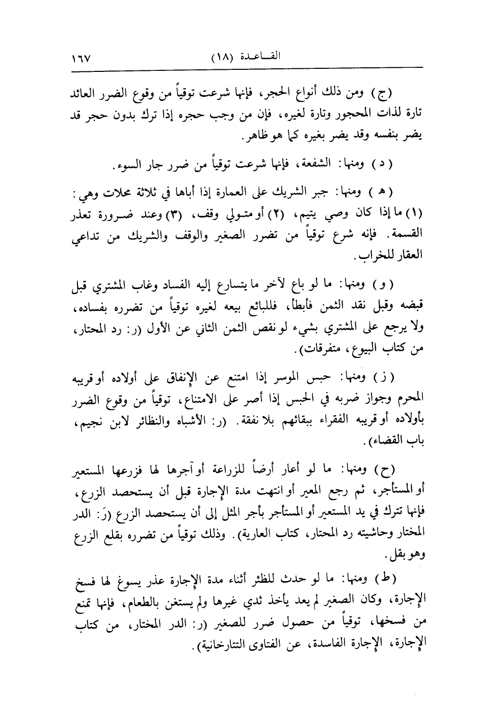 (ج) وَمن ذَلِك أَنْوَاع الْحجر، فَإِنَّهَا شرعت توقياً من وُقُوع الضَّرَر الْعَائِد تَارَة لذات الْمَحْجُور وَتارَة لغيره، فَإِن من وَجب حجره إِذا ترك بِدُونِ حجر قد يضر بِنَفسِهِ وَقد يضر بِغَيْرِهِ كَمَا هُوَ ظَاهر.