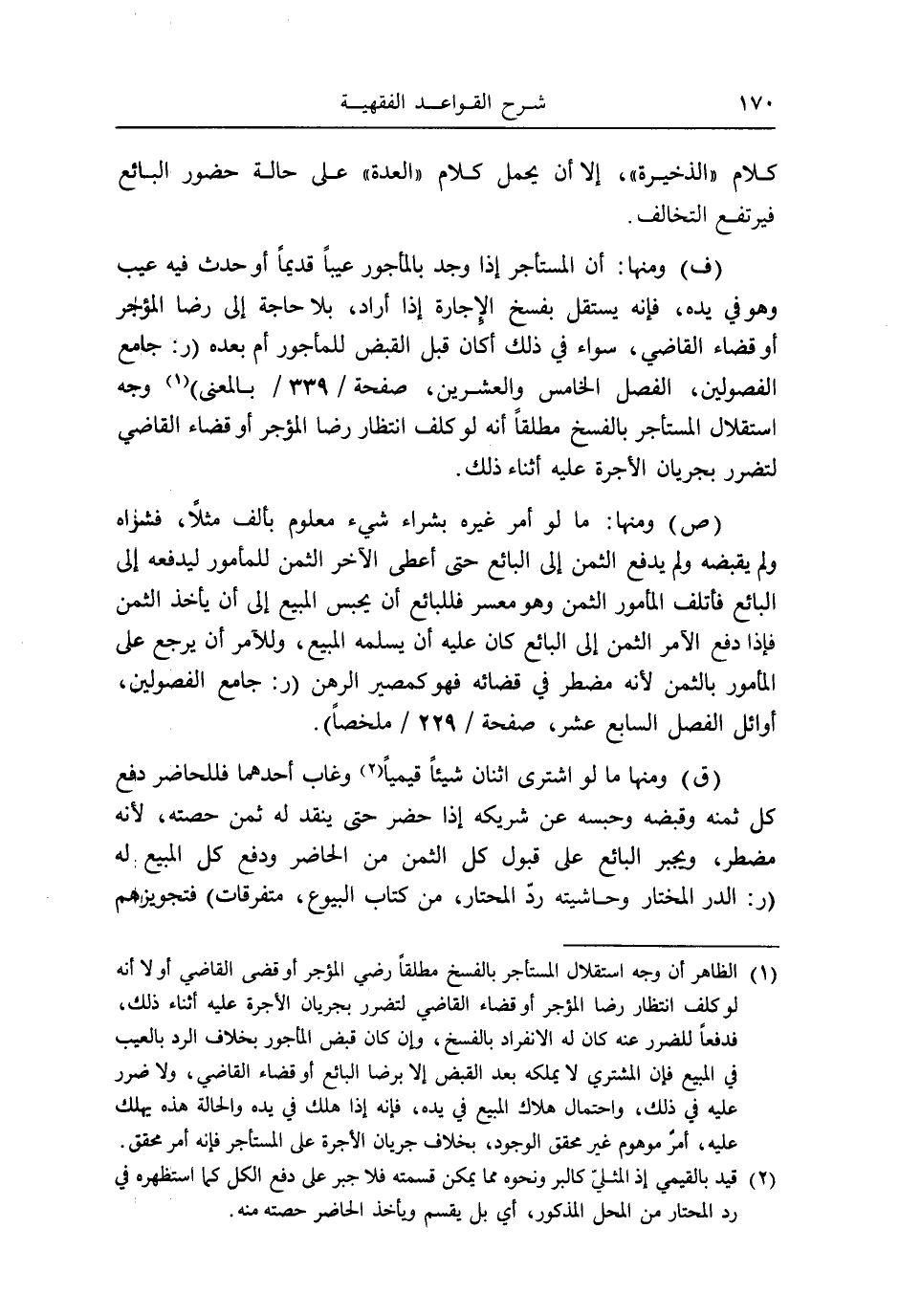 (ف) وَمِنْهَا: أَن الْمُسْتَأْجر إِذا وجد بالمأجور عَيْبا قَدِيما أَو حدث فِيهِ عيب وَهُوَ فِي يَده، فَإِنَّهُ يسْتَقلّ بِفَسْخ الْإِجَارَة إِذا أَرَادَ، بِلَا حَاجَة إِلَى رضَا الْمُؤَجّر أَو قَضَاء القَاضِي، سَوَاء فِي ذَلِك أَكَانَ قبل الْقَبْض للمأجور أم بعده (ر: جَامع الْفُصُولَيْنِ، الْفَصْل الْخَامِس وَالْعِشْرين، صفحة / ٣٣٩ / بِالْمَعْنَى) وَجه اسْتِقْلَال الْمُسْتَأْجر بِالْفَسْخِ مُطلقًا أَنه لَو كلف انْتِظَار رضَا الْمُؤَجّر أَو قَضَاء القَاضِي لتضرر بجريان الْأُجْرَة عَلَيْهِ أثْنَاء ذَلِك.