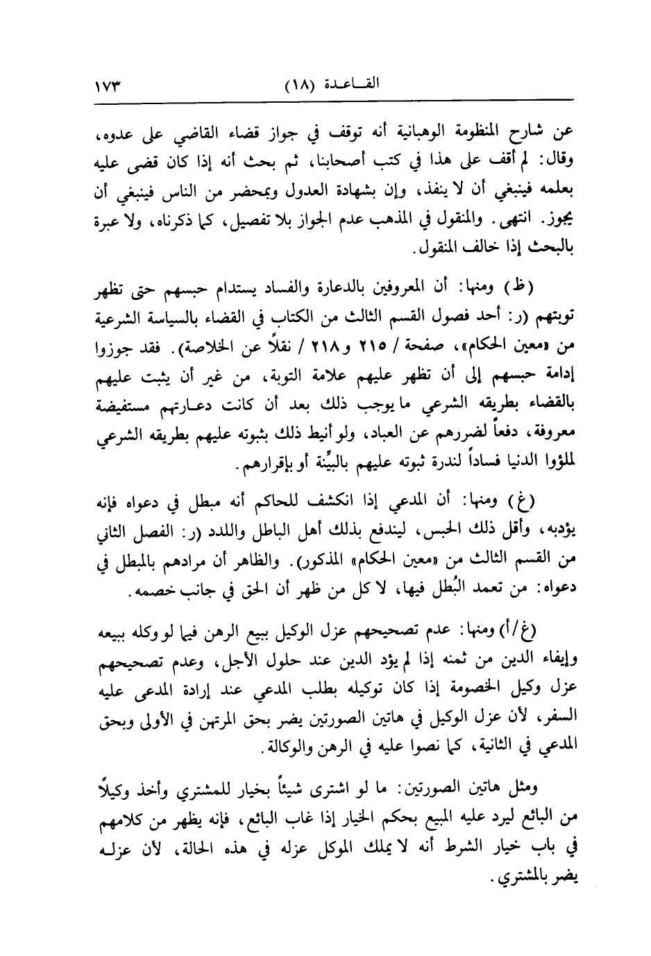 (غ) وَمِنْهَا: أَن الْمُدَّعِي إِذا انْكَشَفَ للْحَاكِم أَنه مُبْطل فِي دَعْوَاهُ فَإِنَّهُ يؤدبه، وَأَقل ذَلِك الْحَبْس، ليندفع بذلك أهل الْبَاطِل واللدد (ر: الْفَصْل الثَّانِي من الْقسم الثَّالِث من " معِين الْحُكَّام " الْمَذْكُور) . وَالظَّاهِر أَن مُرَادهم بالمبطل فِي دَعْوَاهُ: من تعمد البطل فِيهَا، لَا كل من ظهر أَن الْحق فِي جَانب خَصمه.