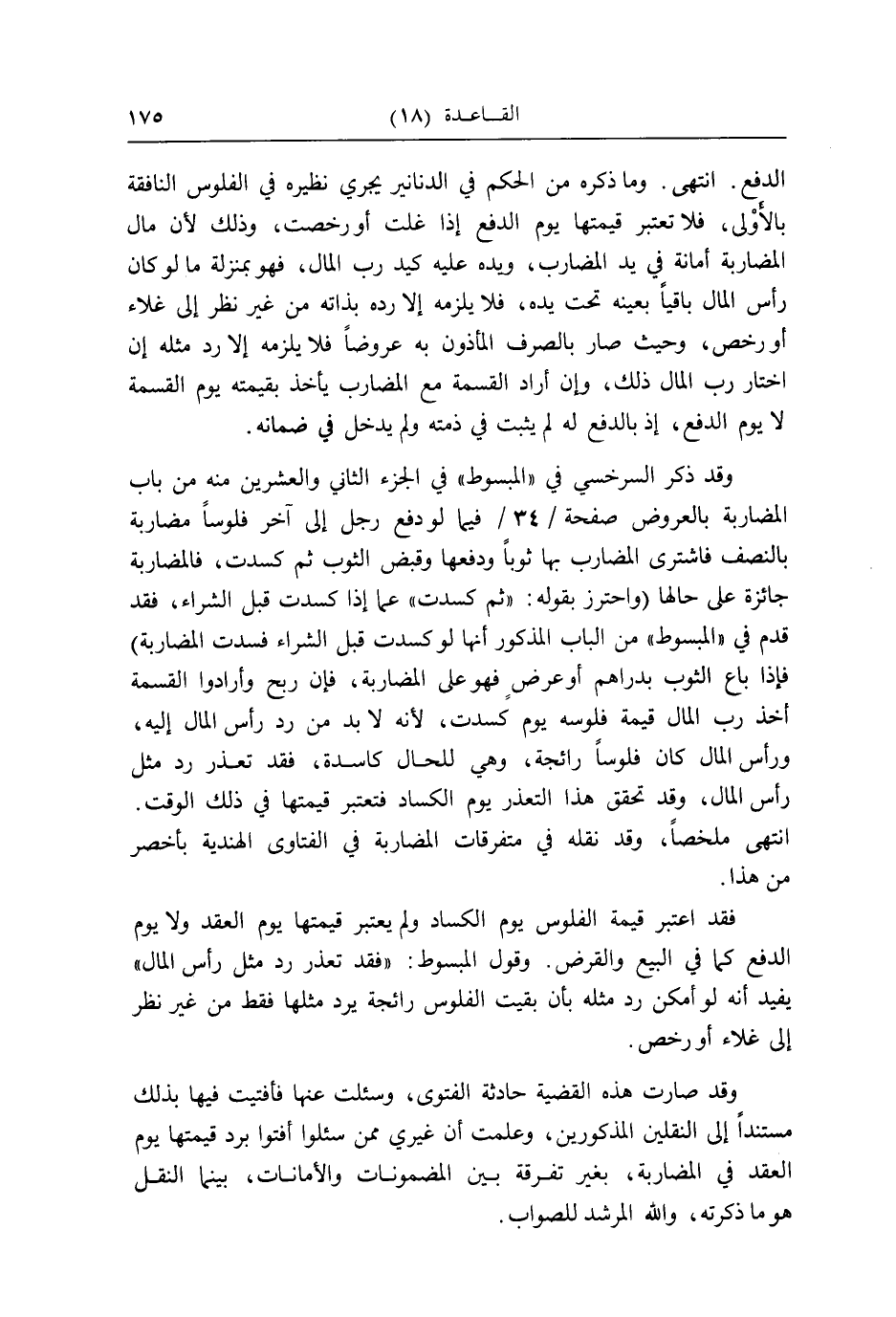 وَقد ذكر السَّرخسِيّ فِي " الْمَبْسُوط " فِي الْجُزْء الثَّانِي وَالْعِشْرين مِنْهُ من بَاب الْمُضَاربَة بالعروض صفحة / ٣٤ / فِيمَا لَو دفع رجل إِلَى آخر فُلُوسًا مُضَارَبَة بِالنِّصْفِ فَاشْترى الْمضَارب بهَا ثوبا وَدفعهَا وَقبض الثَّوْب ثمَّ كسدت، فالمضاربة جَائِزَة على حَالهَا (وَاحْترز بقوله: " ثمَّ كسدت " عَمَّا إِذا كسدت قبل الشِّرَاء، فقد قدم فِي " الْمَبْسُوط " من الْبَاب الْمَذْكُور أَنَّهَا لَو كسدت قبل الشِّرَاء فَسدتْ الْمُضَاربَة) فَإِذا بَاعَ الثَّوْب بِدَرَاهِم أَو عرض فَهُوَ على الْمُضَاربَة، فَإِن ربح وَأَرَادُوا الْقِسْمَة أَخذ رب المَال قيمَة فلوسه يَوْم كسدت، لِأَنَّهُ لَا بُد من رد رَأس المَال إِلَيْهِ، وَرَأس المَال كَانَ فُلُوسًا رائجة، وَهِي للْحَال كاسدة، فقد تعذر رد مثل رَأس المَال، وَقد تحقق هَذَا التَّعَذُّر يَوْم الكساد فَتعْتَبر قيمتهَا فِي ذَلِك الْوَقْت. انْتهى مُلَخصا، وَقد نَقله فِي متفرقات الْمُضَاربَة فِي الْفَتَاوَى الْهِنْدِيَّة بأخصر من هَذَا.