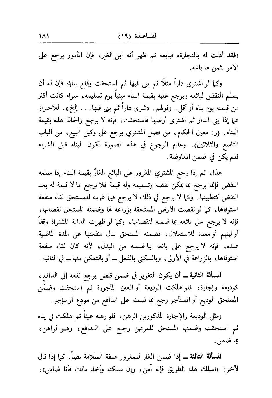 هَذَا، ثمَّ إِذا رَجَعَ المُشْتَرِي الْمَغْرُور على البَائِع الْغَار بِقِيمَة الْبناء إِذا سلمه النَّقْض فَإِنَّمَا يرجع بِمَا يُمكن نقضه وتسليمه وَله قيمَة فَلَا يرجع بِمَا لَا قيمَة لَهُ بعد النَّقْض كتطيينها. وكما لَا يرجع فِي ذَلِك لَا يرجع فِيمَا غرمه للْمُسْتَحقّ لِقَاء مَنْفَعَة استوفاها، كَمَا لَو نقصت الأَرْض الْمُسْتَحقَّة بزراعة لَهَا وَضَمنَهُ الْمُسْتَحق نقصانها، فَإِنَّهُ لَا يرجع على بَائِعه بِمَا ضمنه لنقصانها، وكما لَو ظَهرت الدَّابَّة الْمُشْتَرَاة وَقفا أَو ليتيم أَو معدة للِاسْتِغْلَال، فضمنه الْمُسْتَحق بدل مَنْفَعَتهَا عَن الْمدَّة الْمَاضِيَة عِنْده، فَإِنَّهُ لَا يرجع على بَائِعه بِمَا ضمنه من الْبَدَل، لِأَنَّهُ كَانَ لِقَاء مَنْفَعَة استوفاها، بالزراعة فِي الأولى، وبالسكنى بِالْفِعْلِ - أَو بالتمكن مِنْهَا - فِي الثَّانِيَة.