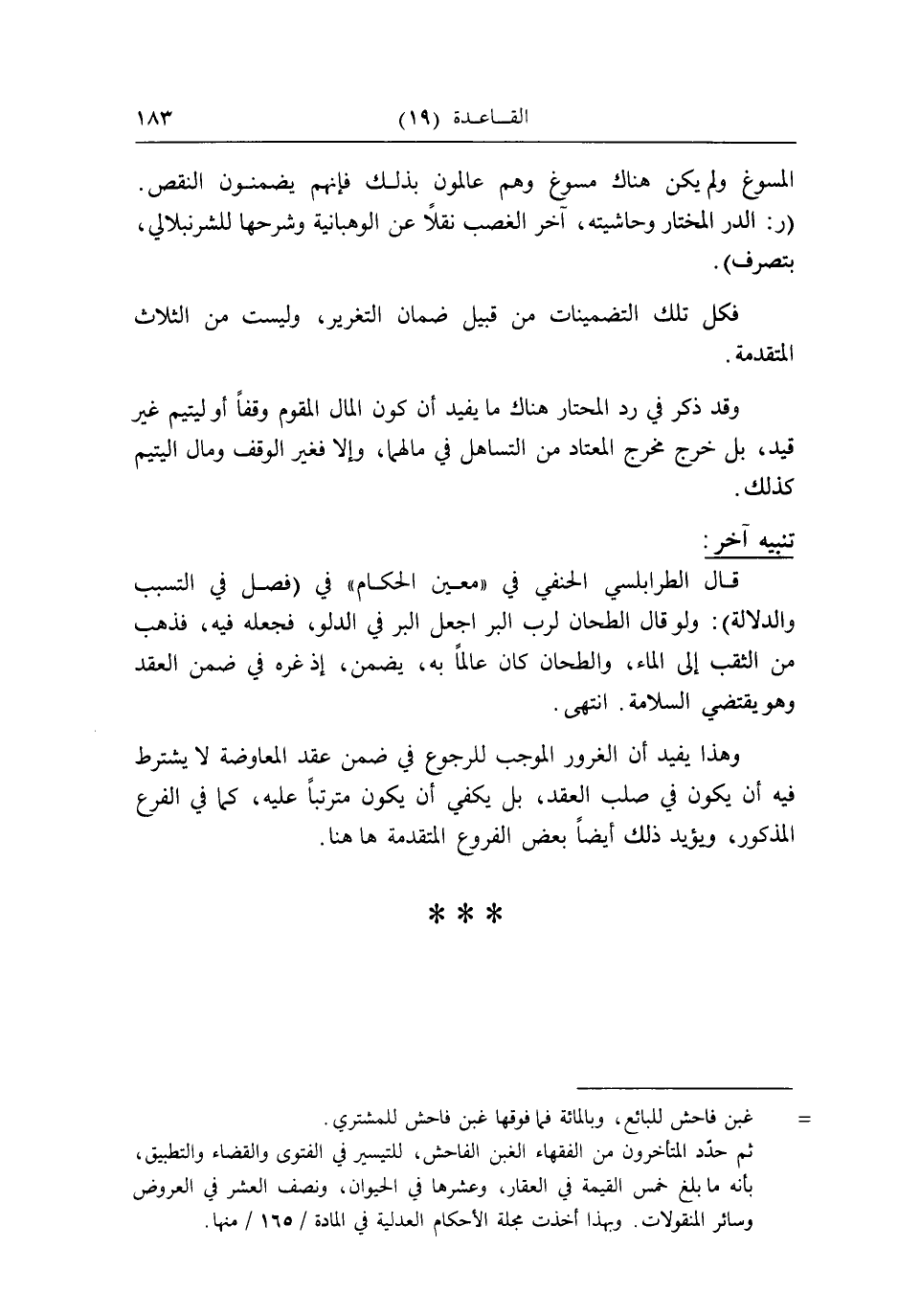 وَهَذَا يُفِيد أَن الْغرُور الْمُوجب للرُّجُوع فِي ضمن عقد الْمُعَاوضَة لَا يشْتَرط فِيهِ أَن يكون فِي صلب العقد، بل يَكْفِي أَن يكون مترتباً عَلَيْهِ، كَمَا فِي الْفَرْع الْمَذْكُور، وَيُؤَيّد ذَلِك أَيْضا بعض الْفُرُوع الْمُتَقَدّمَة هَا هُنَا.