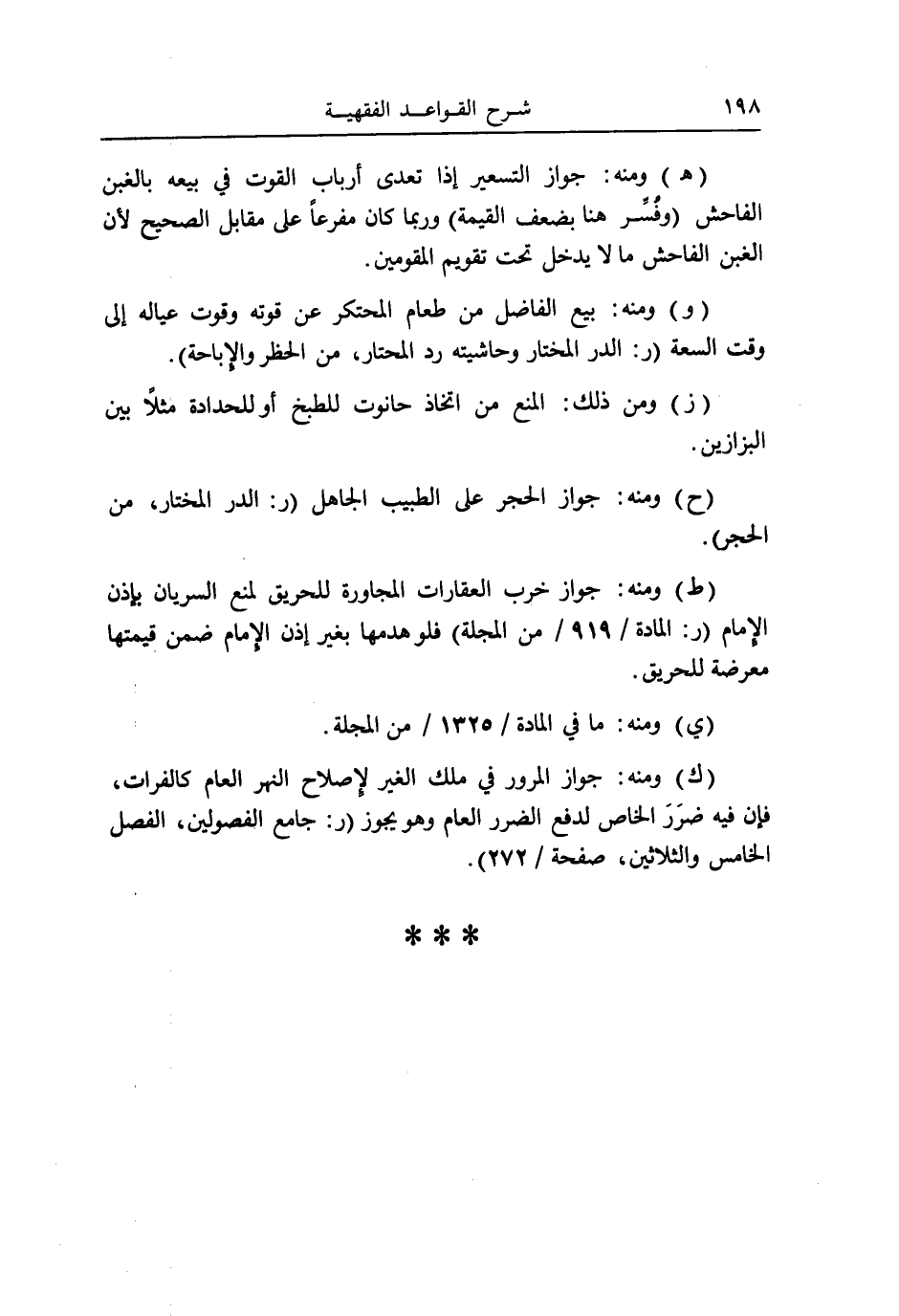 (ط) وَمِنْه: جَوَاز خرب العقارات الْمُجَاورَة للحريق لمنع السريان بِإِذن الإِمَام (ر: الْمَادَّة / ٩١٩ / من الْمجلة) فَلَو هدمها بِغَيْر إِذن الإِمَام ضمن قيمتهَا معرضة للحريق.