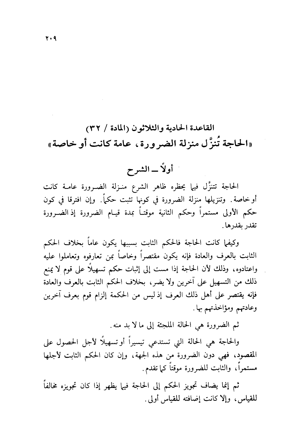 الْحَاجة تتنزل فِيمَا يحظره ظَاهر الشَّرْع منزلَة الضَّرُورَة عَامَّة كَانَت أَو خَاصَّة. وتنزيلها منزلَة الضَّرُورَة فِي كَونهَا تثبت حكما. وَإِن افْتَرقَا فِي كَون حكم الأولى مستمراً وَحكم الثَّانِيَة موقتاً بِمدَّة قيام الضَّرُورَة إِذْ الضَّرُورَة تقدر بِقَدرِهَا.
