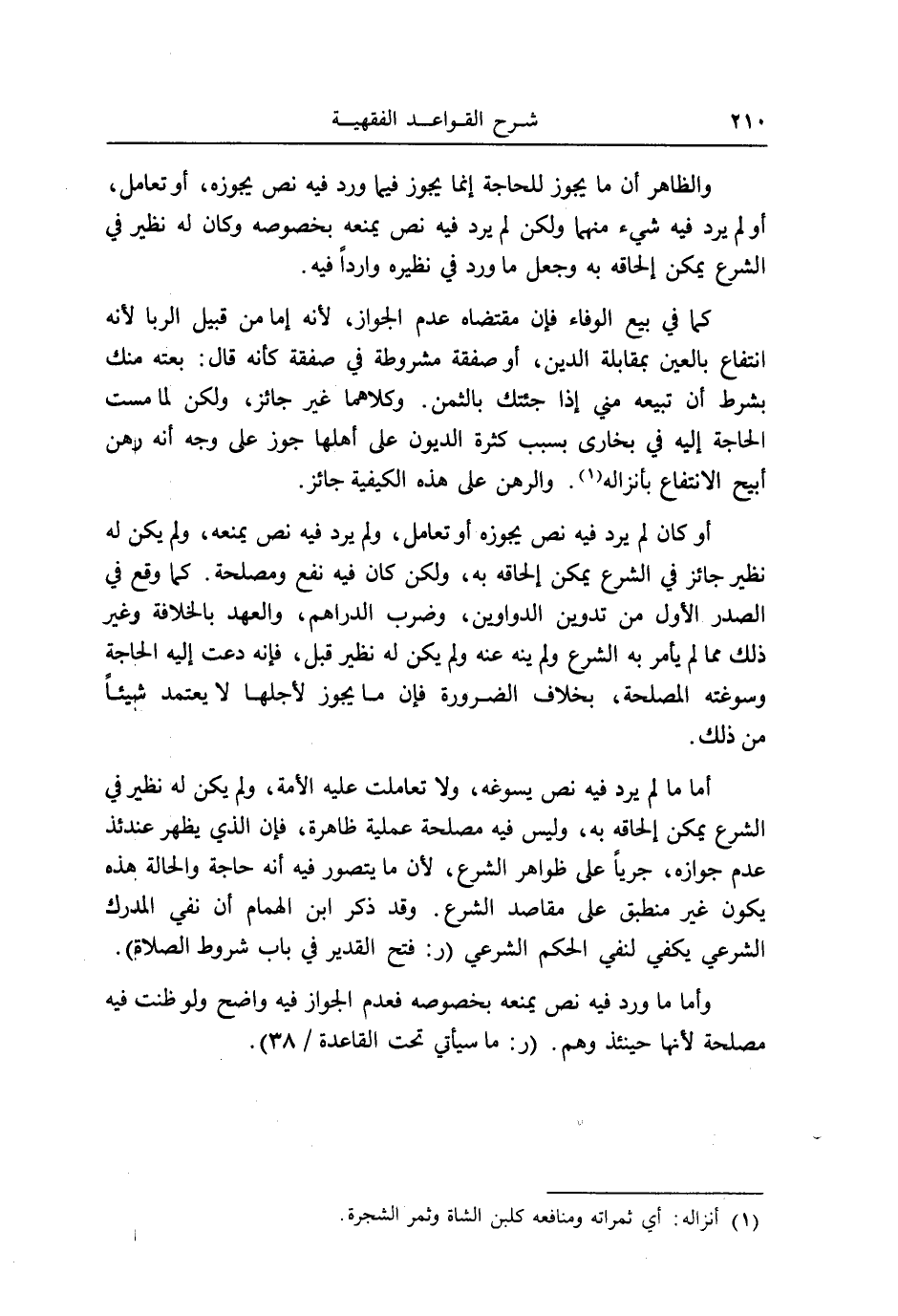 وَالظَّاهِر أَن مَا يجوز للْحَاجة إِنَّمَا يجوز فِيمَا ورد فِيهِ نَص يجوزه، أَو تعامل، أَو لم يرد فِيهِ شَيْء مِنْهُمَا وَلَكِن لم يرد فِيهِ نَص يمنعهُ بِخُصُوصِهِ وَكَانَ لَهُ نَظِير فِي الشَّرْع يُمكن إِلْحَاقه بِهِ وَجعل مَا ورد فِي نَظِيره وارداً فِيهِ.