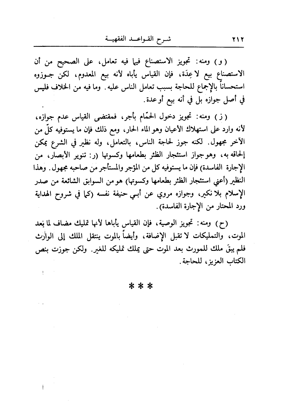 (ز) وَمِنْه: تَجْوِيز دُخُول الْحمام بِأَجْر، فَمُقْتَضى الْقيَاس عدم جَوَازه، لِأَنَّهُ وَارِد على اسْتِهْلَاك الْأَعْيَان وَهُوَ المَاء الْحَار، وَمَعَ ذَلِك فَإِن مَا يَسْتَوْفِيه كل من الآخر مَجْهُول. لكنه جوز لحَاجَة النَّاس، بالتعامل، وَله نَظِير فِي الشَّرْع يُمكن إِلْحَاقه بِهِ، وَهُوَ جَوَاز اسْتِئْجَار الظِّئْر بطعامها وكسوتها (ر: تنوير الْأَبْصَار، من الْإِجَارَة الْفَاسِدَة) فَإِن مَا يَسْتَوْفِيه كل من الْمُؤَجّر وَالْمُسْتَأْجر من صَاحبه مَجْهُول. وَهَذَا النظير (أَعنِي اسْتِئْجَار الظِّئْر بطعامها وكسوتها) هُوَ من السوابق الشائعة من صدر الْإِسْلَام بِلَا نَكِير، وجوازه مَرْوِيّ عَن أبي حنيفَة نَفسه (كَمَا فِي شُرُوح الْهِدَايَة ورد الْمُحْتَار من الْإِجَارَة الْفَاسِدَة) .