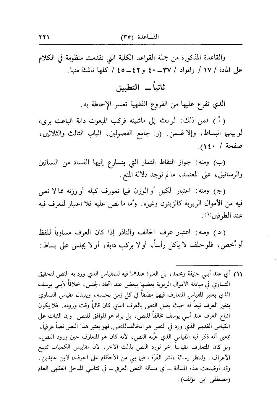 (ج) وَمِنْه: اعْتِبَار الْكَيْل أَو الْوَزْن فِيمَا تعورف كَيْله أَو وَزنه مِمَّا لَا نَص فِيهِ من الْأَمْوَال الربوية كالزيتون وَغَيره. وَأما مَا نَص عَلَيْهِ فَلَا اعْتِبَار للْعُرْف فِيهِ عِنْد الطَّرفَيْنِ.