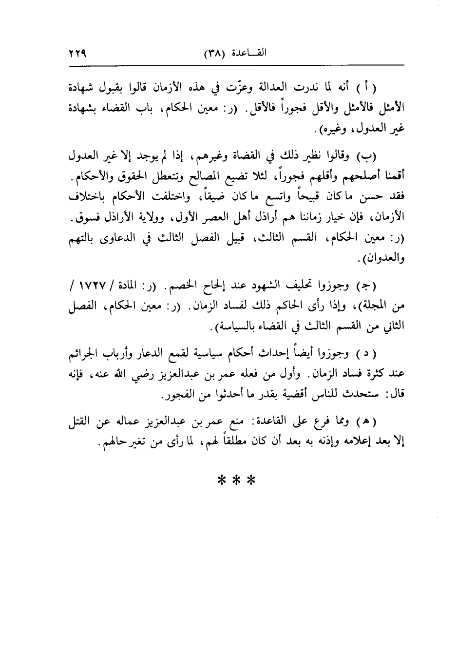 (د) وجوزوا أَيْضا إِحْدَاث أَحْكَام سياسية لقمع الدعار وأرباب الجرائم عِنْد كَثْرَة فَسَاد الزَّمَان. وَأول من فعله عمر بن عبد الْعَزِيز رَضِي الله عَنهُ، فَإِنَّهُ قَالَ: ستحدث للنَّاس أقضية بِقدر مَا أَحْدَثُوا من الْفُجُور.