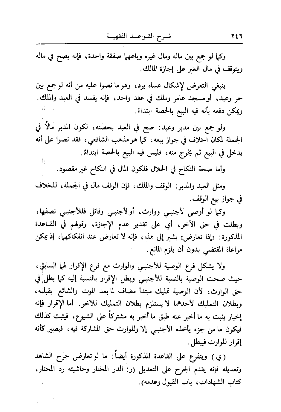 يَنْبَغِي التَّعَرُّض لإشكال عساه يرد، وَهُوَ مَا نصوا عَلَيْهِ من أَنه لَو جمع بَين حر وَعبد، أَو مَسْجِد عَامر وَملك فِي عقد وَاحِد، فَإِنَّهُ يفْسد فِي العَبْد وَالْملك. وَيُمكن دَفعه بِأَنَّهُ فِيهِ البيع بِالْحِصَّةِ ابْتِدَاء.
