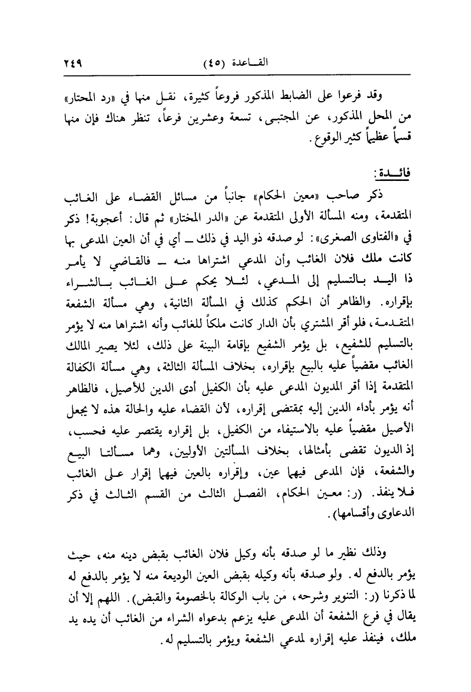 وَذَلِكَ نَظِير لما لَو صدقه بِأَنَّهُ وَكيل فلَان الْغَائِب بِقَبض دينه مِنْهُ، حَيْثُ يُؤمر بِالدفع لَهُ. وَلَو صدقه بِأَنَّهُ وَكيله بِقَبض الْعين الْوَدِيعَة مِنْهُ لَا يُؤمر بِالدفع لَهُ لما ذكرنَا (ر: التَّنْوِير وَشَرحه، من بَاب الْوكَالَة بِالْخُصُومَةِ وَالْقَبْض) . اللَّهُمَّ إِلَّا أَن يُقَال فِي فرع الشُّفْعَة أَن الْمُدعى عَلَيْهِ يزْعم بِدَعْوَاهُ الشِّرَاء من الْغَائِب أَن يَده يَد ملك، فَينفذ عَلَيْهِ إِقْرَاره لمُدعِي الشُّفْعَة وَيُؤمر بِالتَّسْلِيمِ لَهُ.