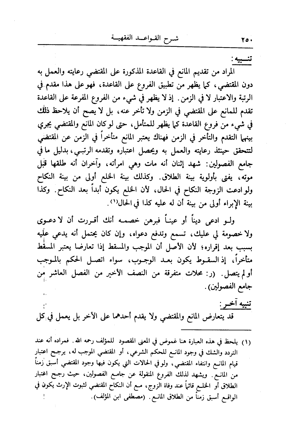 المُرَاد من تَقْدِيم الْمَانِع فِي الْقَاعِدَة الْمَذْكُورَة على الْمُقْتَضِي رعايته وَالْعَمَل بِهِ دون الْمُقْتَضِي، كَمَا يظْهر من تطبيق الْفُرُوع على الْقَاعِدَة، فَهُوَ على هَذَا مقدم فِي الرُّتْبَة وَالِاعْتِبَار لَا فِي الزَّمن. إِذْ لَا يظْهر فِي شَيْء من الْفُرُوع المفرعة على الْقَاعِدَة تقدم للمانع على الْمُقْتَضِي فِي الزَّمن وَلَا تَأَخّر عَنهُ، بل لَا يَصح أَن يُلَاحظ ذَلِك فِي شَيْء من فروع الْقَاعِدَة كَمَا يظْهر للمتأمل، حَتَّى لَو كَانَ الْمَانِع والمقتضي يجْرِي بَينهمَا التَّقَدُّم والتأخر فِي الزَّمن فهناك يعْتَبر الْمَانِع مُتَأَخِّرًا فِي الزَّمن عَن الْمُقْتَضِي لتتحقق حِينَئِذٍ رعايته وَالْعَمَل بِهِ وَيحصل اعْتِبَاره وتقدمه الرتبي، بِدَلِيل مَا فِي جَامع الْفُصُولَيْنِ: شهد اثْنَان أَنه مَاتَ وَهِي امْرَأَته، وآخران أَنه طَلقهَا قبل مَوته، يُفْتى بأولوية بَيِّنَة الطَّلَاق. وَكَذَلِكَ بَيِّنَة الْخلْع أولى من بَيِّنَة النِّكَاح وَلَو ادَّعَت الزَّوْجَة النِّكَاح فِي الْحَال، لِأَن الْخلْع يكون أبدا بعد النِّكَاح. وَكَذَا بَيِّنَة الْإِبْرَاء أولى من بَيِّنَة أَن لَهُ عَلَيْهِ كَذَا فِي الْحَال.