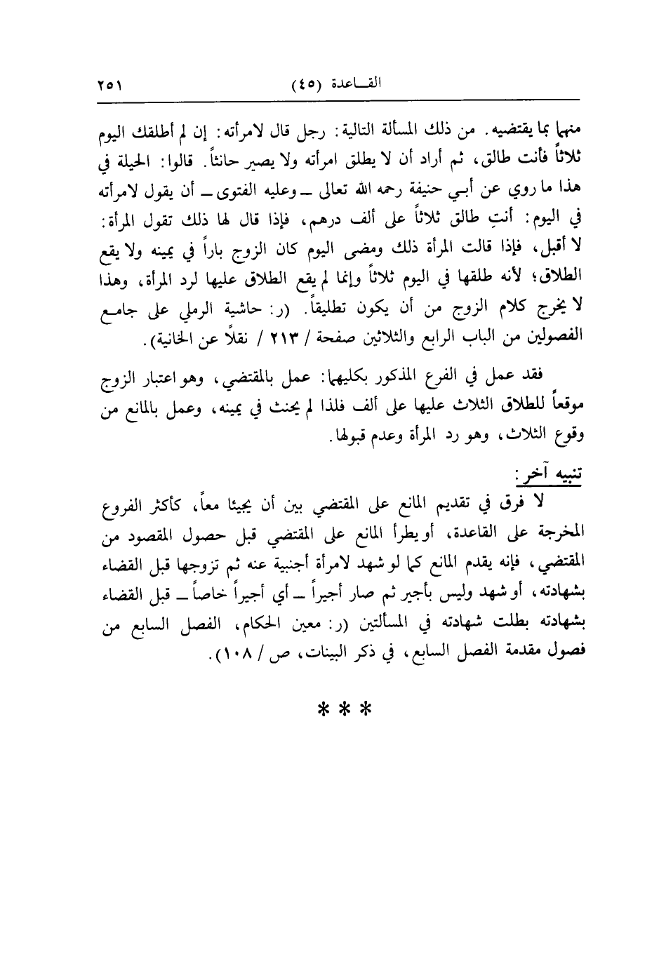 فقد عمل فِي الْفَرْع الْمَذْكُور بكليهما: عمل بالمقتضي، وَهُوَ اعْتِبَار الزَّوْج موقعاً للطَّلَاق الثَّلَاث عَلَيْهَا على ألف فَلِذَا لم يَحْنَث فِي يَمِينه، وَعمل بالمانع من وُقُوع الثَّلَاث، وَهُوَ رد الْمَرْأَة وَعدم قبُولهَا.