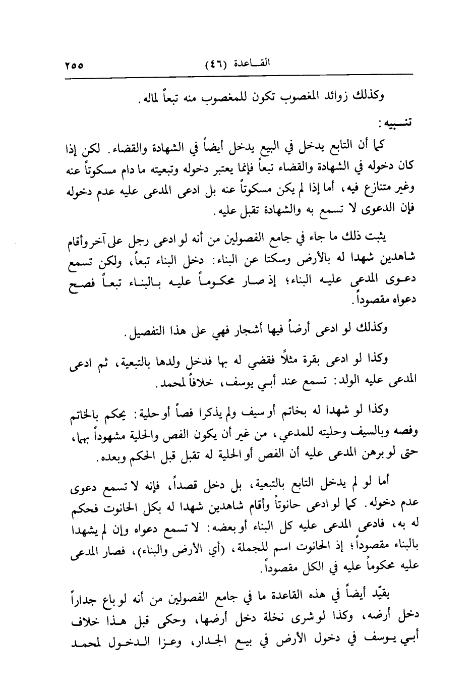 كَمَا أَن التَّابِع يدْخل فِي البيع يدْخل أَيْضا فِي الشَّهَادَة وَالْقَضَاء. لَكِن إِذا كَانَ دُخُوله فِي الشَّهَادَة وَالْقَضَاء تبعا فَإِنَّمَا يعْتَبر دُخُوله وتبعيته مَا دَامَ مسكوتاً عَنهُ وَغير متنازع فِيهِ، أما إِذا لم يكن مسكوتاً عَنهُ بل ادّعى الْمُدعى عَلَيْهِ عدم دُخُوله فَإِن الدَّعْوَى لَا تسمع بِهِ وَالشَّهَادَة تقبل عَلَيْهِ.