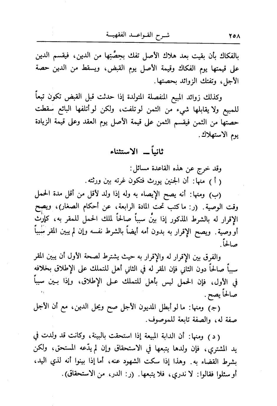 وَقد خرج عَن هَذِه الْقَاعِدَة مسَائِل: (أ) مِنْهَا: أَن الْجَنِين يُورث فَتكون غرته بَين ورثته.