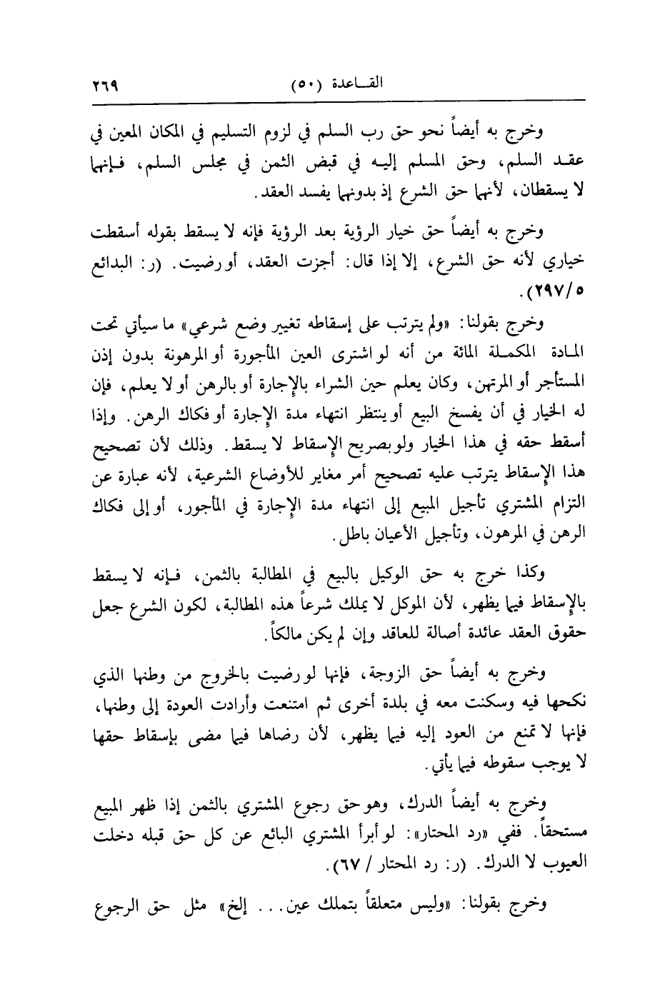 وَخرج بقولنَا: " وَلم يَتَرَتَّب على إِسْقَاطه تَغْيِير وضع شَرْعِي " مَا سَيَأْتِي تَحت الْمَادَّة المكملة الْمِائَة من أَنه لَو اشْترى الْعين المأجورة أَو الْمَرْهُونَة بِدُونِ إِذن الْمُسْتَأْجر أَو الْمُرْتَهن، وَكَانَ يعلم حِين الشِّرَاء بِالْإِجَارَة أَو بِالرَّهْنِ أَو لَا يعلم، فَإِن لَهُ الْخِيَار فِي أَن يفْسخ البيع أَو ينْتَظر انْتِهَاء مُدَّة الْإِجَارَة أَو فكاك الرَّهْن. وَإِذا أسقط حَقه فِي هَذَا الْخِيَار وَلَو بِصَرِيح الْإِسْقَاط لَا يسْقط. وَذَلِكَ لِأَن تَصْحِيح هَذَا الْإِسْقَاط يَتَرَتَّب عَلَيْهِ تَصْحِيح أَمر مُغَاير للأوضاع الشَّرْعِيَّة، لِأَنَّهُ عبارَة عَن الْتِزَام المُشْتَرِي تَأْجِيل الْمَبِيع إِلَى انْتِهَاء مُدَّة الْإِجَارَة فِي الْمَأْجُور، أَو إِلَى فكاك الرَّهْن فِي الْمَرْهُون، وتأجيل الْأَعْيَان بَاطِل.