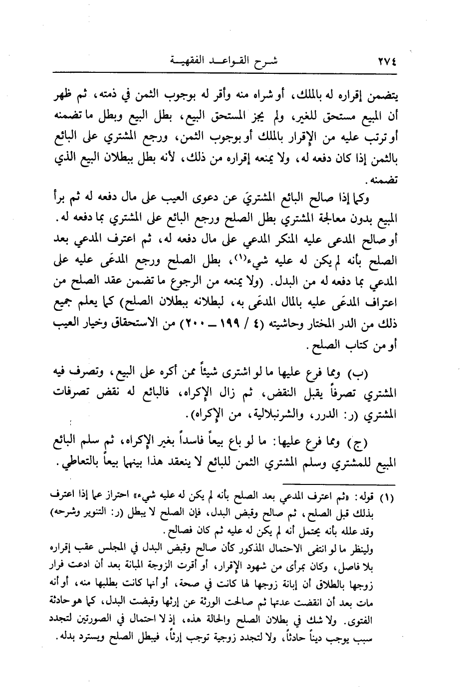 وكما إِذا صَالح البَائِع المُشْتَرِي عَن دَعْوَى الْعَيْب على مَال دَفعه لَهُ ثمَّ برأَ الْمَبِيع بِدُونِ معالجة المُشْتَرِي بَطل الصُّلْح وَرجع البَائِع على المُشْتَرِي بِمَا دَفعه لَهُ. أَو صَالح الْمُدعى عَلَيْهِ الْمُنكر الْمُدَّعِي على مَال دَفعه لَهُ، ثمَّ اعْترف الْمُدَّعِي بعد الصُّلْح بِأَنَّهُ لم يكن لَهُ عَلَيْهِ شَيْء، بَطل الصُّلْح وَرجع الْمُدعى عَلَيْهِ على الْمُدَّعِي بِمَا دَفعه لَهُ من الْبَدَل. (وَلَا يمنعهُ من الرُّجُوع مَا تضمن عقد الصُّلْح من اعْتِرَاف الْمُدعى عَلَيْهِ بِالْمَالِ الْمُدعى بِهِ، لبطلانه بِبُطْلَان الصُّلْح) كَمَا يعلم جَمِيع ذَلِك من الدّرّ الْمُخْتَار وحاشيته (٤ / ١٩٩ - ٢٠٠) من الِاسْتِحْقَاق وَخيَار الْعَيْب أَو من كتاب الصُّلْح.