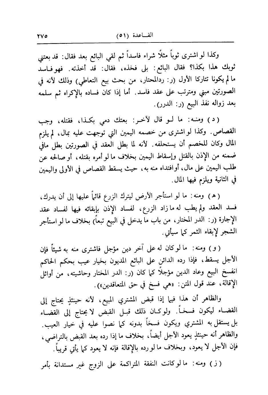 (د) وَمِنْه: مَا لَو قَالَ لآخر: بِعْتُك دمي بِكَذَا، فَقتله، وَجب الْقصاص. وَكَذَا لَو اشْترى من خَصمه الْيَمين الَّتِي تَوَجَّهت عَلَيْهِ بِمَال، لم يلْزم المَال وَكَانَ للخصم أَن يستحلفه. لِأَنَّهُ لما بَطل العقد فِي الصُّورَتَيْنِ بَطل مَا فِي ضمنه من الْإِذْن بِالْقَتْلِ وَإِسْقَاط الْيَمين بِخِلَاف مَا لَو أمره بقتْله، أَو صَالحه عَن طلب الْيَمين على مَال، أَو افتداه مِنْهُ بِهِ، حَيْثُ يسْقط الْقصاص فِي الأولى وَالْيَمِين فِي الثَّانِيَة وَيلْزم فِيهَا المَال.