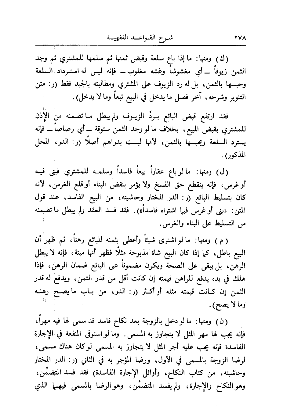 (ل) وَمِنْهَا: مَا لَو بَاعَ عقارا بيعا فَاسِدا وَسلمهُ للْمُشْتَرِي فَبنى فِيهِ أَو غرس، فَإِنَّهُ يَنْقَطِع حق الْفَسْخ وَلَا يُؤمر بِنَقْض الْبناء أَو قلع الْغَرْس، لِأَنَّهُ كَانَ بتسليط البَائِع (ر: الدّرّ الْمُخْتَار وحاشيته، من البيع الْفَاسِد، عِنْد قَول الْمَتْن: " بنى أَو غرس فِيمَا اشْتَرَاهُ فَاسِدا ") . فقد فسد العقد وَلم يبطل مَا تضمنه من التسليط على الْبناء وَالْغَرْس.