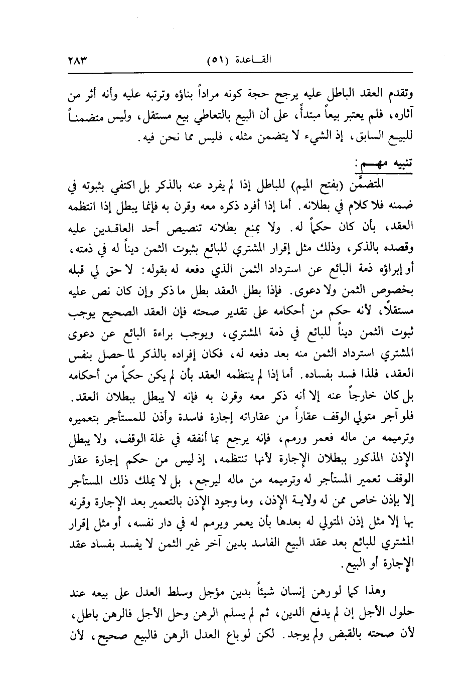 المتضمن (بِفَتْح الْمِيم) للباطل إِذا لم يفرد عَنهُ بِالذكر بل اكْتفي بِثُبُوتِهِ فِي ضمنه فَلَا كَلَام فِي بُطْلَانه. أما إِذا أفرد ذكره مَعَه وَقرن بِهِ فَإِنَّمَا يبطل إِذا انتظمه العقد، بِأَن كَانَ حكما لَهُ. وَلَا يمْنَع بُطْلَانه تنصيص أحد الْعَاقِدين عَلَيْهِ وقصده بِالذكر، وَذَلِكَ مثل إِقْرَار المُشْتَرِي للْبَائِع بِثُبُوت الثّمن دينا لَهُ فِي ذمَّته، أَو إبراؤه ذمَّة البَائِع عَن اسْتِرْدَاد الثّمن الَّذِي دَفعه لَهُ بقوله: لَا حق لي قبله بِخُصُوص الثّمن وَلَا دَعْوَى. فَإِذا بَطل العقد بَطل مَا ذكر وَإِن كَانَ نَص عَلَيْهِ مُسْتقِلّا، لِأَنَّهُ حكم من أَحْكَامه على تَقْدِير صِحَّته فَإِن العقد الصَّحِيح يُوجب ثُبُوت الثّمن دينا للْبَائِع فِي ذمَّة المُشْتَرِي، وَيُوجب بَرَاءَة البَائِع عَن دَعْوَى المُشْتَرِي اسْتِرْدَاد الثّمن مِنْهُ بعد دَفعه لَهُ، فَكَانَ إِفْرَاده بِالذكر لما حصل بِنَفس العقد، فَلِذَا فسد بفساده. أما إِذا لم ينتظمه العقد بِأَن لم يكن حكما من أَحْكَامه بل كَانَ خَارِجا عَنهُ إِلَّا أَنه ذكر مَعَه وَقرن بِهِ فَإِنَّهُ لَا يبطل بِبُطْلَان العقد. فَلَو آجر مُتَوَلِّي الْوَقْف عقارا من عقاراته إِجَارَة فَاسِدَة وَأذن للْمُسْتَأْجر بتعميره وترميمه من مَاله فعمر ورمم، فَإِنَّهُ يرجع بِمَا أنفقهُ فِي غلَّة الْوَقْف، وَلَا يبطل الْإِذْن الْمَذْكُور بِبُطْلَان الْإِجَارَة لِأَنَّهَا تنتظمه، إِذْ لَيْسَ من حكم إِجَارَة عقار الْوَقْف تعمير الْمُسْتَأْجر لَهُ وترميمه من مَاله ليرْجع، بل لَا يملك ذَلِك الْمُسْتَأْجر إِلَّا بِإِذن خَاص مِمَّن لَهُ ولَايَة الْإِذْن، وَمَا وجود الْإِذْن بالتعمير بعد الْإِجَارَة وقرنه بهَا إِلَّا مثل إِذن الْمُتَوَلِي لَهُ بعْدهَا بِأَن يعمر ويرمم لَهُ فِي دَار نَفسه، أَو مثل إِقْرَار المُشْتَرِي للْبَائِع بعد عقد البيع الْفَاسِد بدين آخر غير الثّمن لَا يفْسد بِفساد عقد الْإِجَارَة أَو البيع.