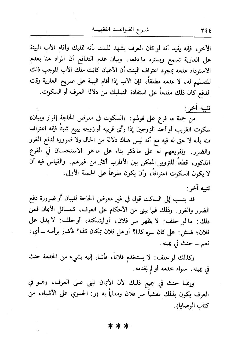 من جملَة مَا فرع على قَوْلهم: " السُّكُوت فِي معرض الْحَاجة إِقْرَار وَبَيَان " سكُوت الْقَرِيب أَو أحد الزَّوْجَيْنِ إِذا رأى قَرِيبه أَو زوجه يَبِيع شَيْئا فَإِنَّهُ اعْتِرَاف مِنْهُ بِأَنَّهُ لَا حق لَهُ فِيهِ مَعَ أَنه لَيْسَ هُنَاكَ دلَالَة من الْحَال وَلَا ضَرُورَة لدفع الْغرَر وَالضَّرَر. وتفريعهم لَهُ على مَا ذكر بِنَاء على مَا هُوَ الِاسْتِحْسَان فِي الْفَرْع الْمَذْكُور، قطعا للتزوير الْمُمكن بَين الْأَقَارِب أَكثر من غَيرهم. وَالْقِيَاس فِيهِ أَن لَا يكون السُّكُوت اعترافاً، وَأَن يكون مفرعاً على الْجُمْلَة الأولى.