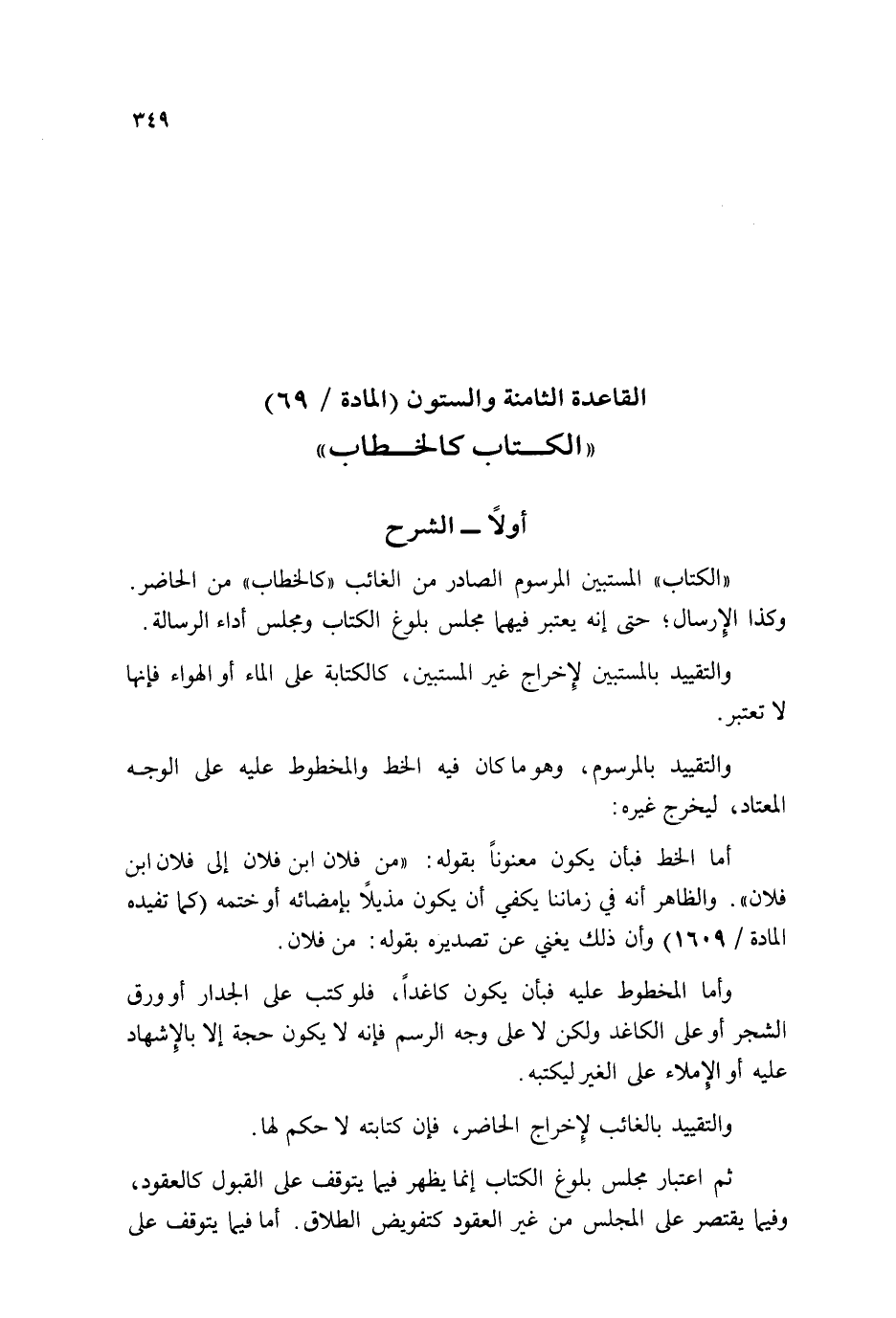 أما الْخط فبأن يكون معنوناً بقوله: " من فلَان ابْن فلَان إِلَى فلَان ابْن فلَان ". وَالظَّاهِر أَنه فِي زَمَاننَا يَكْفِي أَن يكون مذيلاً بإمضائه أَو خَتمه (كَمَا تفيده الْمَادَّة / ١٦٠٩) وَأَن ذَلِك يُغني عَن تصديره بقوله: من فلَان.