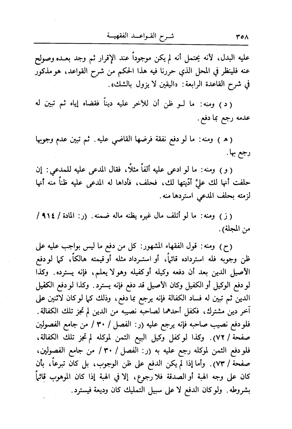 (ح) وَمِنْه: قَول الْفُقَهَاء الْمَشْهُور: كل من دفع مَا لَيْسَ بِوَاجِب عَلَيْهِ على ظن وُجُوبه فَلهُ اسْتِرْدَاده قَائِما، أَو اسْتِرْدَاد مثله أَو قِيمَته هَالكا، كَمَا لَو دفع الْأَصِيل الدّين بعد أَن دَفعه وَكيله أَو كفيله وَهُوَ لَا يعلم، فَإِنَّهُ يسْتَردّهُ. وَكَذَا لَو دفع الْوَكِيل أَو الْكَفِيل وَكَانَ الْأَصِيل قد دفع فَإِنَّهُ يسْتَردّ. وَكَذَا لَو دفع الْكَفِيل الدّين ثمَّ تبين لَهُ فَسَاد الْكفَالَة فَإِنَّهُ يرجع بِمَا دفع، وَذَلِكَ كَمَا لَو كَانَ لاثْنَيْنِ على آخر دين مُشْتَرك، فكفل أَحدهمَا لصَاحبه نصِيبه من الدّين لم تجز تِلْكَ الْكفَالَة. فَلَو دفع نصيب صَاحبه فَإِنَّهُ يرجع عَلَيْهِ (ر: الْفَصْل / ٣٠ / من جَامع الْفُصُولَيْنِ صفحة / ٧٢) . وَكَذَا لَو كفل وَكيل البيع الثّمن لمُوكلِه لم تجز تِلْكَ الْكفَالَة، فَلَو دفع الثّمن لمُوكلِه رَجَعَ عَلَيْهِ بِهِ (ر: الْفَصْل / ٣٠ / من جَامع الْفُصُولَيْنِ، صفحة / ٧٣) . وَأما إِذا لم يكن الدّفع على ظن الْوُجُوب، بل كَانَ تَبَرعا، بِأَن كَانَ على وَجه الْهِبَة أَو الصَّدَقَة فَلَا رُجُوع، إِلَّا فِي الْهِبَة إِذا كَانَ الْمَوْهُوب قَائِما بِشُرُوطِهِ. وَلَو كَانَ الدّفع على سَبِيل التَّمْلِيك كَانَ وَدِيعَة فيسترد.