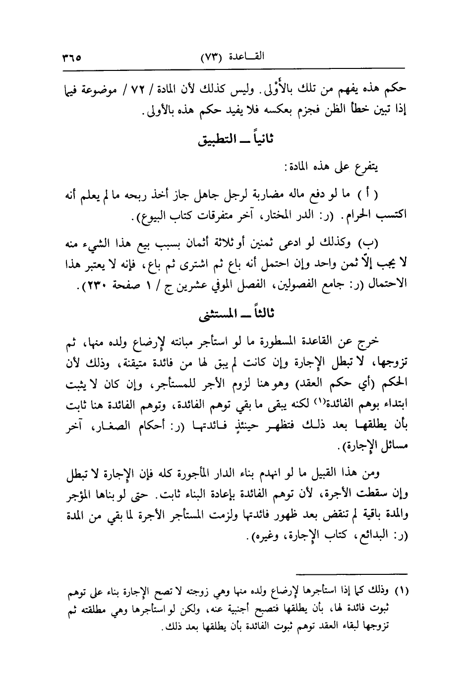 خرج عَن الْقَاعِدَة المسطورة مَا لَو اسْتَأْجر مبانته لإرضاع وَلَده مِنْهَا، ثمَّ تزَوجهَا، لَا تبطل الْإِجَارَة وَإِن كَانَت لم يبْق لَهَا من فَائِدَة متيقنة، وَذَلِكَ لِأَن الحكم (أَي حكم العقد) وَهُوَ هُنَا لُزُوم الْأجر للْمُسْتَأْجر، وَإِن كَانَ لَا يثبت ابْتِدَاء بوهم الْفَائِدَة لكنه يبْقى مَا بَقِي توهم الْفَائِدَة، وتوهم الْفَائِدَة هُنَا ثَابت بِأَن يطلقهَا بعد ذَلِك فتظهر حينئذٍ فائدتها (ر: أَحْكَام الصغار، آخر مسَائِل الْإِجَارَة) .