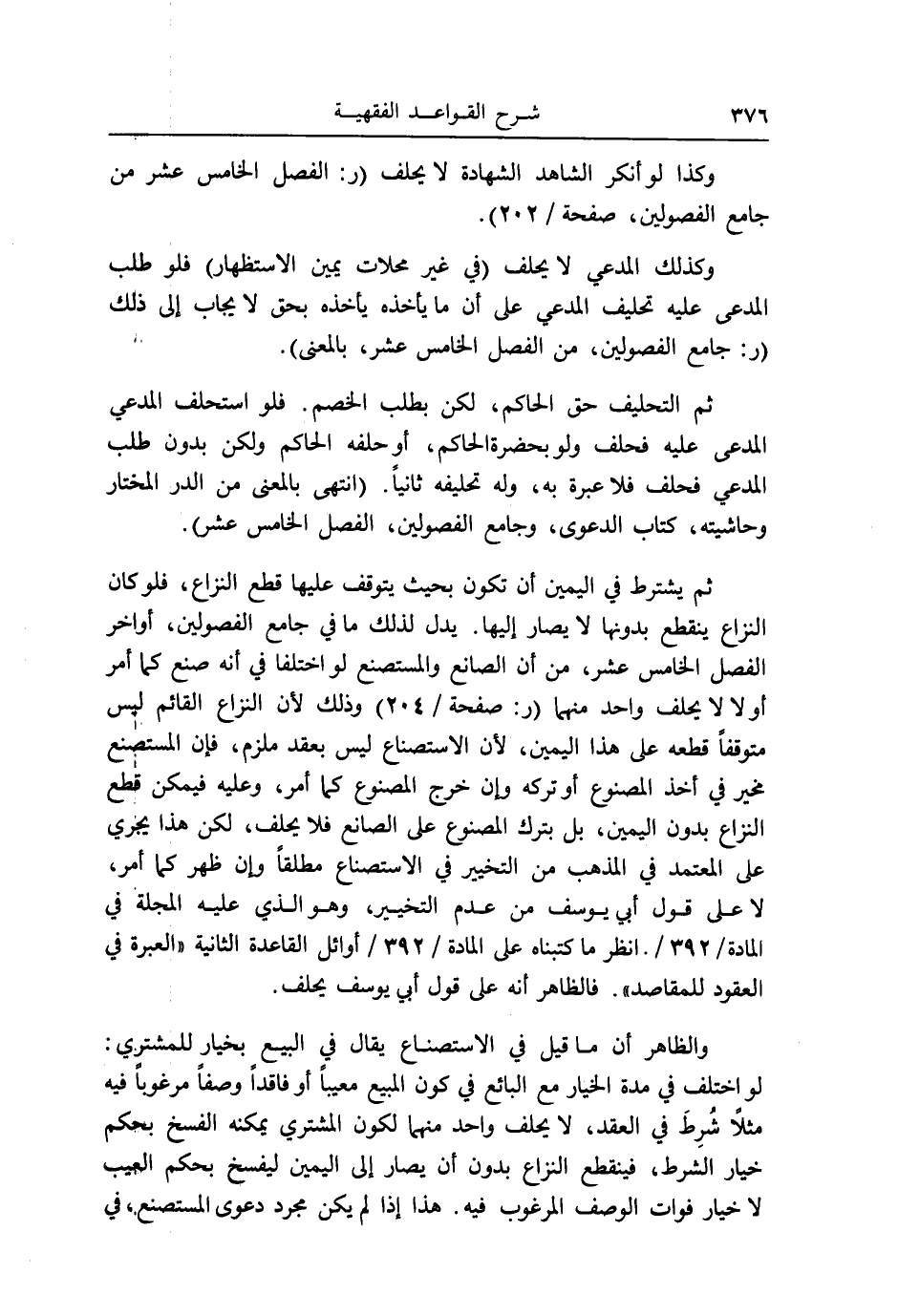 ثمَّ يشْتَرط فِي الْيَمين أَن تكون بِحَيْثُ يتَوَقَّف عَلَيْهَا قطع النزاع، فَلَو كَانَ النزاع يَنْقَطِع بِدُونِهَا لَا يُصَار إِلَيْهَا. يدل لذَلِك مَا فِي جَامع الْفُصُولَيْنِ، أَوَاخِر الْفَصْل الْخَامِس عشر، من أَن الصَّانِع والمستصنع لَو اخْتلفَا فِي أَنه صنع كَمَا أَمر أَو لَا لَا يحلف وَاحِد مِنْهُمَا (ر: صفحة / ٢٠٤) وَذَلِكَ لِأَن النزاع الْقَائِم لَيْسَ متوقفاً قطعه على هَذَا الْيَمين، لِأَن الاستصناع لَيْسَ بِعقد مُلْزم، فَإِن المستصنع مُخَيّر فِي أَخذ الْمَصْنُوع أَو تَركه وَإِن خرج الْمَصْنُوع كَمَا أَمر، وَعَلِيهِ فَيمكن قطع النزاع بِدُونِ الْيَمين، بل بترك الْمَصْنُوع على الصَّانِع فَلَا يحلف، لَكِن هَذَا يجْرِي على الْمُعْتَمد فِي الْمَذْهَب من التَّخْيِير فِي الاستصناع مُطلقًا وَإِن ظهر كَمَا أَمر، لَا على قَول أبي يُوسُف من عدم التَّخْيِير، وَهُوَ الَّذِي عَلَيْهِ الْمجلة فِي الْمَادَّة / ٣٩٢ /. انْظُر مَا كتبناه على الْمَادَّة / ٣٩٢ / أَوَائِل الْقَاعِدَة الثَّانِيَة " الْعبْرَة فِي الْعُقُود للمقاصد ". فَالظَّاهِر أَنه على قَول أبي يُوسُف يحلف.