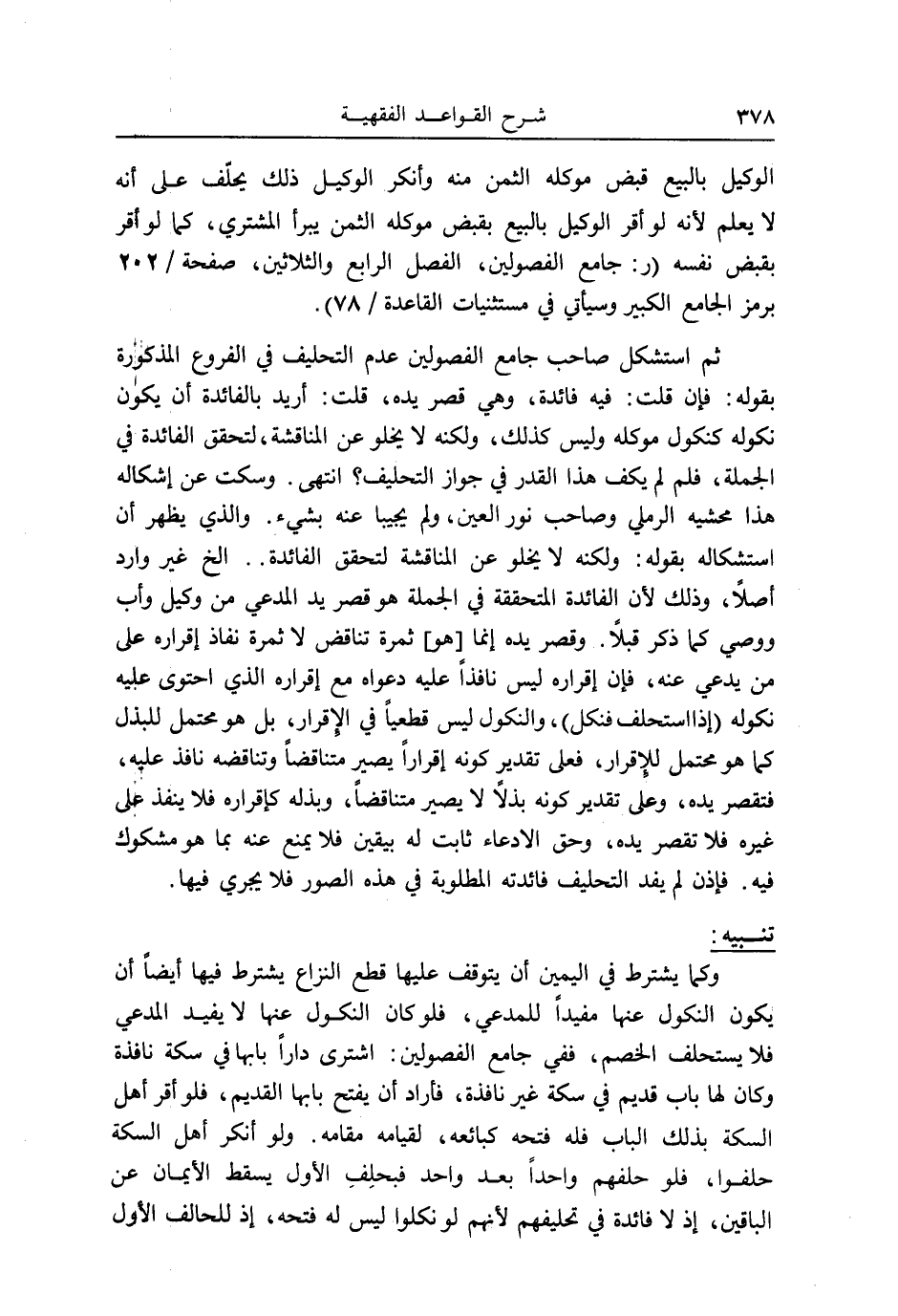 ثمَّ اسْتشْكل صَاحب جَامع الْفُصُولَيْنِ عدم التَّحْلِيف فِي الْفُرُوع الْمَذْكُورَة بقوله: فَإِن قلت فِيهِ فَائِدَة، وَهِي قصر يَده، قلت: أُرِيد بالفائدة أَن يكون نُكُوله كنكول مُوكله وَلَيْسَ كَذَلِك، وَلكنه لَا يَخْلُو عَن المناقشة، لتحَقّق الْفَائِدَة فِي الْجُمْلَة، فَلم لم يكف هَذَا الْقدر فِي جَوَاز التَّحْلِيف؟ انْتهى. وَسكت عَن إشكاله هَذَا محشيه الرَّمْلِيّ وَصَاحب نور الْعين، وَلم يجيبا عَنهُ بِشَيْء. وَالَّذِي يظْهر أَن استشكاله بقوله: وَلكنه لَا يَخْلُو عَن المناقشة لتحَقّق الْفَائِدَة ... الخ غير وَارِد أصلا، وَذَلِكَ لِأَن الْفَائِدَة المتحققة فِي الْجُمْلَة هُوَ قصر يَد الْمُدَّعِي من وَكيل وَأب ووصي كَمَا ذكر قبلا. وَقصر يَده إِنَّمَا [هُوَ] ثَمَرَة تنَاقض لَا ثَمَرَة نَفاذ إِقْرَاره على من يَدعِي عَنهُ، فَإِن إِقْرَاره لَيْسَ نَافِذا عَلَيْهِ دَعْوَاهُ مَعَ إِقْرَاره الَّذِي احتوى عَلَيْهِ نُكُوله (إِذا اسْتحْلف فنكل) ، والنكول لَيْسَ قَطْعِيا فِي الْإِقْرَار، بل هُوَ مُحْتَمل للبذل كَمَا هُوَ مُحْتَمل للإقرار، فعلى تَقْدِير كَونه إِقْرَارا يصير متناقضاً وتناقضه نَافِذ عَلَيْهِ، فتقصر يَده، وعَلى تَقْدِير كَونه بذلاً لَا يصير متناقضاً، وبذله كإقراره فَلَا ينفذ على غَيره فَلَا تقصر يَده، وَحقّ الادعاء ثَابت لَهُ بِيَقِين فَلَا يمْنَع عَنهُ بِمَا هُوَ مَشْكُوك فِيهِ. فَإِذن لم يفد التَّحْلِيف فَائِدَته الْمَطْلُوبَة فِي هَذِه الصُّور فَلَا يجْرِي فِيهَا.