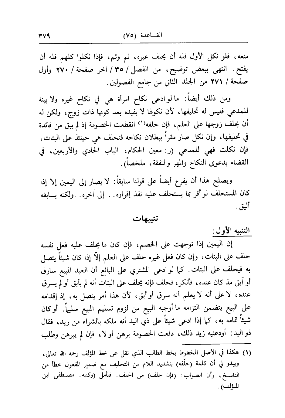 مَنعه، فَلَو نكل الأول فَلهُ أَن يحلف غَيره، ثمَّ وَثمّ، فَإِذا نكلوا كلهم فَلهُ أَن يفتح. انْتهى بِبَعْض توضيح، من الْفَصْل / ٣٥ / آخر صفحة / ٢٧٠ وَأول صفحة / ٢٧١ من الْجلد الثَّانِي من جَامع الْفُصُولَيْنِ.