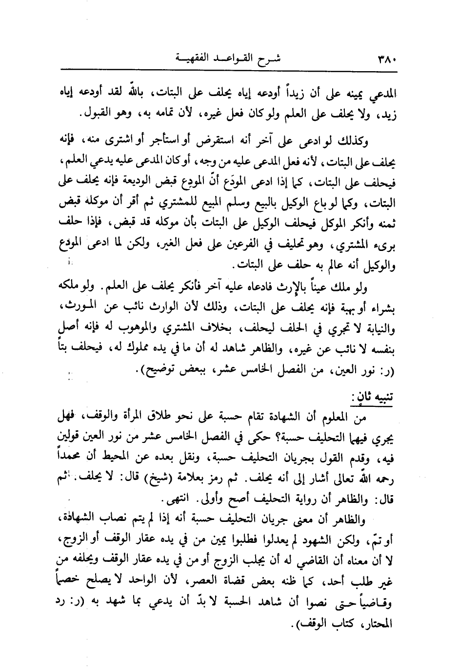 : من الْمَعْلُوم أَن الشَّهَادَة تُقَام حسبَة على نَحْو طَلَاق الْمَرْأَة وَالْوَقْف، فَهَل يجْرِي فيهمَا التَّحْلِيف حسبَة؟ حكى فِي الْفَصْل الْخَامِس عشر من نور الْعين قَوْلَيْنِ فِيهِ، وَقدم القَوْل بجريان التَّحْلِيف حسبَة، وَنقل بعده عَن الْمُحِيط أَن مُحَمَّدًا رَحمَه الله تَعَالَى أَشَارَ إِلَى أَنه يحلف. ثمَّ رمز بعلامة (شيخ) قَالَ: لَا يحلف. ثمَّ قَالَ: وَالظَّاهِر أَن رِوَايَة التَّحْلِيف أصح وَأولى. انْتهى.