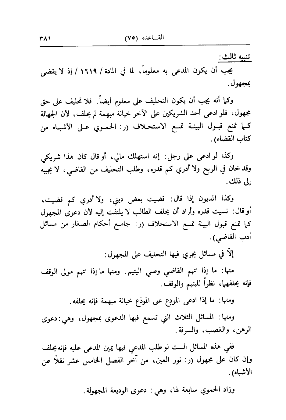 وكما أَنه يجب أَن يكون التَّحْلِيف على مَعْلُوم أَيْضا. فَلَا تَحْلِيف على حق مَجْهُول، فَلَو ادّعى أحد الشَّرِيكَيْنِ على الآخر خِيَانَة مُبْهمَة لم يحلف، لِأَن الْجَهَالَة كَمَا تمنع قبُول الْبَيِّنَة تمنع الِاسْتِحْلَاف (ر: الْحَمَوِيّ على الْأَشْبَاه من كتاب الْقَضَاء) .