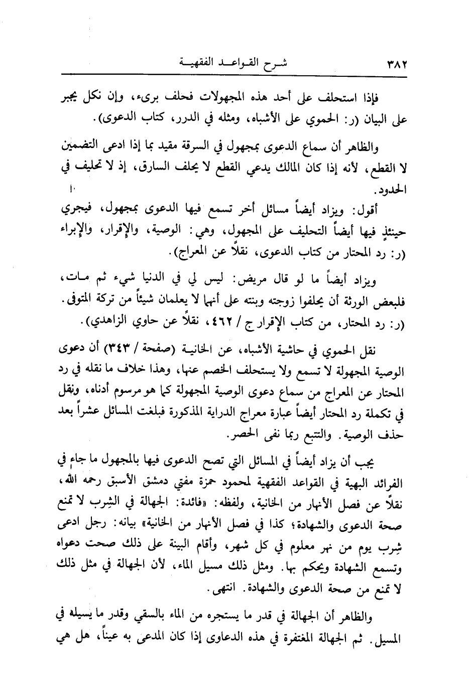 يجب أَن يُزَاد أَيْضا فِي الْمسَائِل الَّتِي تصح الدَّعْوَى فِيهَا بِالْمَجْهُولِ مَا جَاءَ فِي الفرائد البهية فِي الْقَوَاعِد الْفِقْهِيَّة لمحمود حَمْزَة مفتي دمشق الأسبق رَحمَه الله، نقلا عَن فصل الْأَنْهَار من الْخَانِية، وَلَفظه: " فَائِدَة: الْجَهَالَة فِي الشّرْب لَا تمنع صِحَة الدَّعْوَى وَالشَّهَادَة؛ كَذَا فِي فصل الْأَنْهَار من الْخَانِية " بَيَانه: رجل ادّعى شرب يَوْم من نهر مَعْلُوم فِي كل شهر، وَأقَام الْبَيِّنَة على ذَلِك صحت دَعْوَاهُ وَتسمع الشَّهَادَة وَيحكم بهَا. وَمثل ذَلِك مسيل المَاء، لِأَن الْجَهَالَة فِي مثل ذَلِك لَا تمنع من صِحَة الدَّعْوَى وَالشَّهَادَة. انْتهى.