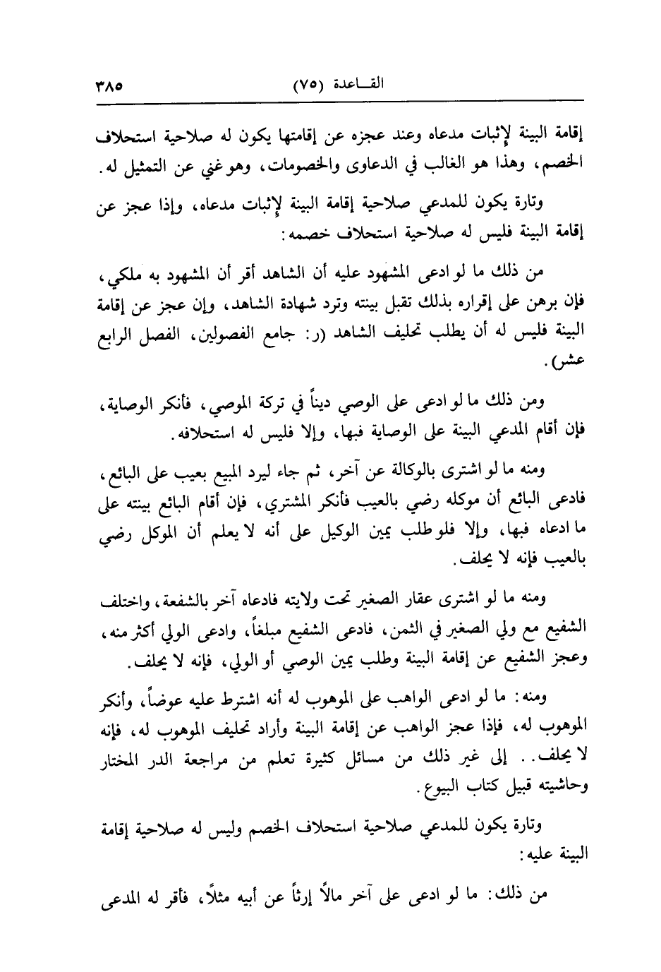 وَتارَة يكون للْمُدَّعِي صَلَاحِية إِقَامَة الْبَيِّنَة لإِثْبَات مدعاه، وَإِذا عجز عَن إِقَامَة الْبَيِّنَة فَلَيْسَ لَهُ صَلَاحِية استحلاف خَصمه: من ذَلِك مَا لَو ادّعى الْمَشْهُود عَلَيْهِ أَن الشَّاهِد أقرّ أَن الْمَشْهُود بِهِ ملكي، فَإِن برهن على إِقْرَاره بذلك تقبل بَينته وَترد شَهَادَة الشَّاهِد، وَإِن عجز عَن إِقَامَة الْبَيِّنَة فَلَيْسَ لَهُ أَن يطْلب تَحْلِيف الشَّاهِد (ر: جَامع الْفُصُولَيْنِ، الْفَصْل الرَّابِع عشر) .