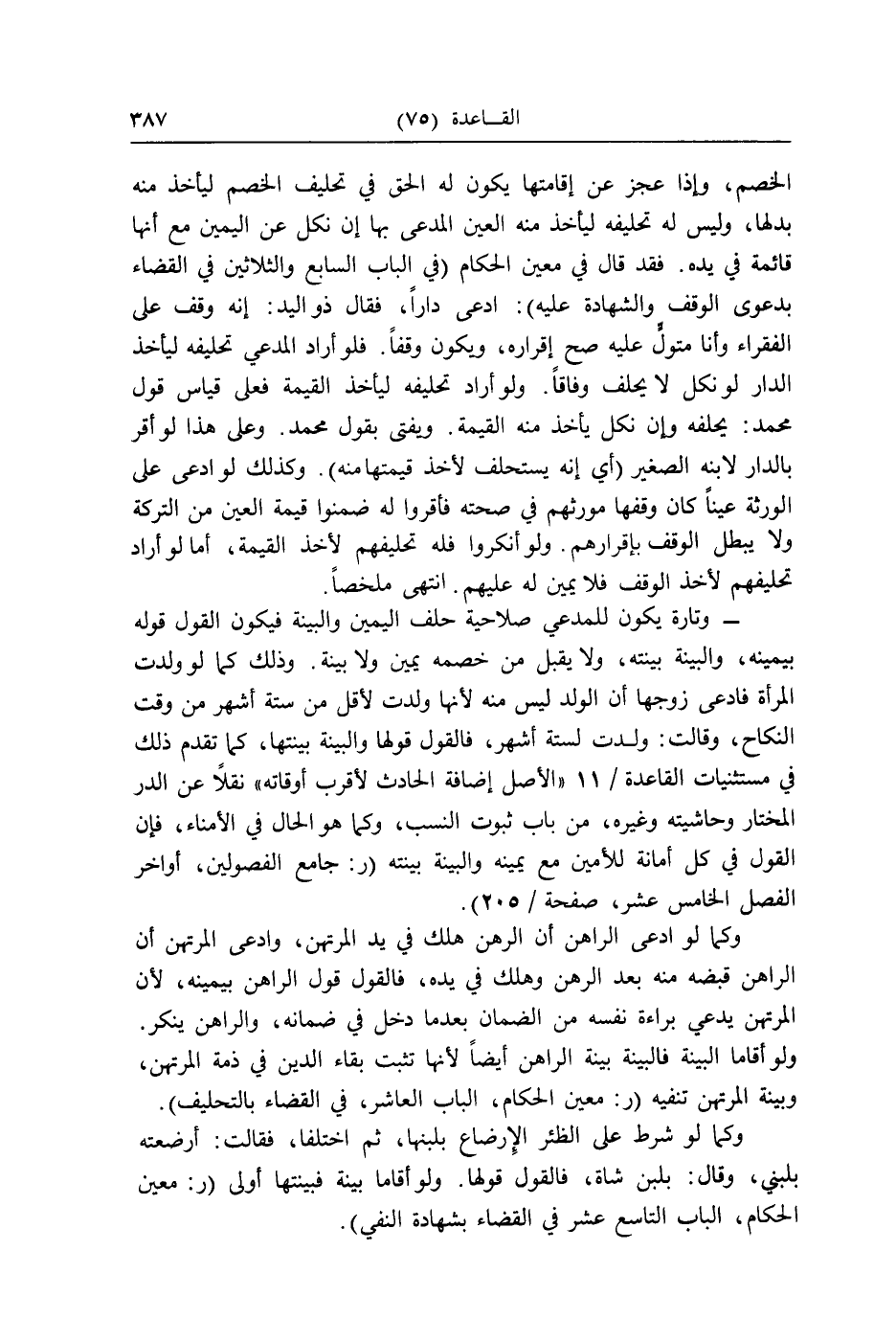 الْخصم، وَإِذا عجز عَن إِقَامَتهَا يكون لَهُ الْحق فِي تَحْلِيف الْخصم ليَأْخُذ مِنْهُ بدلهَا، وَلَيْسَ لَهُ تَحْلِيفه ليَأْخُذ مِنْهُ الْعين الْمُدعى بهَا إِن نكل عَن الْيَمين مَعَ أَنَّهَا قَائِمَة فِي يَده. فقد قَالَ فِي معِين الْحُكَّام (فِي الْبَاب السَّابِع وَالثَّلَاثِينَ فِي الْقَضَاء بِدَعْوَى الْوَقْف وَالشَّهَادَة عَلَيْهِ) : ادّعى دَارا، فَقَالَ ذُو الْيَد: إِنَّه وقف على الْفُقَرَاء وَأَنا متول عَلَيْهِ صَحَّ إِقْرَاره، وَيكون وَقفا. فَلَو ادّعى الْمُدَّعِي تَحْلِيفه ليَأْخُذ الدَّار لَو نكل لَا يحلف وفَاقا. وَلَو أَرَادَ تَحْلِيفه ليَأْخُذ الْقيمَة فعلى قِيَاس قَول مُحَمَّد: يحلفهُ وَإِن نكل يَأْخُذ مِنْهُ الْقيمَة. ويفتى بقول مُحَمَّد. وعَلى هَذَا لَو أقرّ بِالدَّار لِابْنِهِ الصَّغِير (أَي إِنَّه يسْتَحْلف لأخذ قيمتهَا مِنْهُ) . وَكَذَلِكَ لَو ادّعى على الْوَرَثَة عينا كَانَ وَقفهَا مُورثهم فِي صِحَّته فأقروا لَهُ ضمنُوا قيمَة الْعين من التَّرِكَة وَلَا يبطل الْوَقْف بإقرارهم. وَلَو أَنْكَرُوا فَلهُ تحليفهم لأخذ الْقيمَة، أما لَو أَرَادَ تحليفهم لأخذ الْوَقْف فَلَا يَمِين لَهُ عَلَيْهِم. انْتهى مُلَخصا.