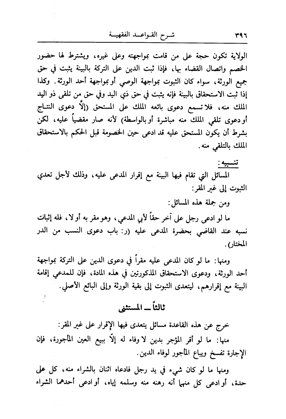 خرج عَن هَذِه الْقَاعِدَة مسَائِل يتَعَدَّى فِيهَا الْإِقْرَار على غير الْمقر: مِنْهَا: مَا لَو أقرّ الْمُؤَجّر بدين لَا وَفَاء لَهُ إِلَّا بِبيع الْعين المأجورة، فَإِن الْإِجَارَة تفسخ وَيُبَاع الْمَأْجُور لوفاء الدّين.