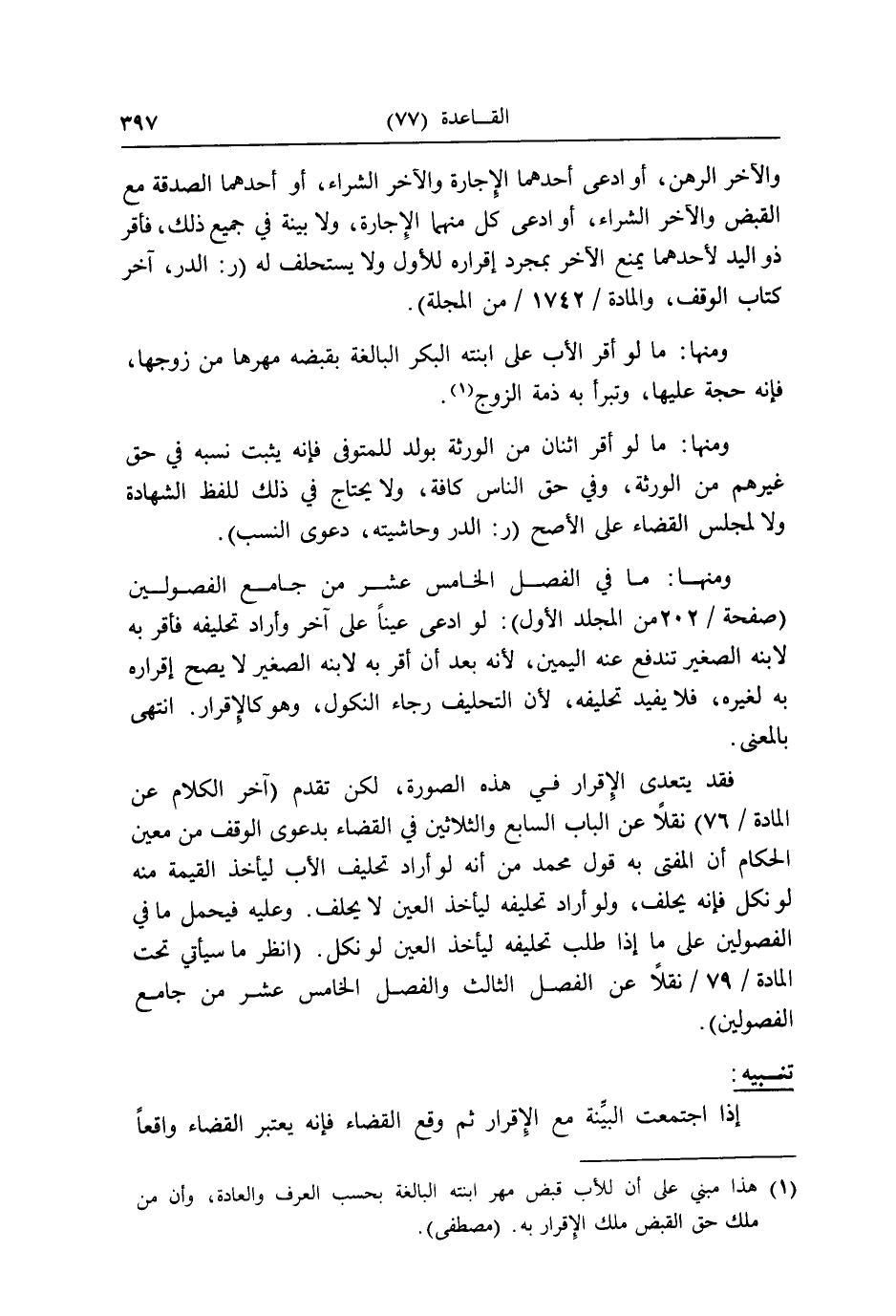 فقد يتَعَدَّى الْإِقْرَار فِي هَذِه الصُّورَة، لَكِن تقدم (آخر الْكَلَام عَن الْمَادَّة / ٧٦) نقلا عَن الْبَاب السَّابِع وَالثَّلَاثِينَ فِي الْقَضَاء بِدَعْوَى الْوَقْف من معِين الْحُكَّام أَن الْمُفْتى بِهِ قَول مُحَمَّد من أَنه لَو أَرَادَ تَحْلِيف الْأَب ليَأْخُذ الْقيمَة مِنْهُ لَو نكل فَإِنَّهُ يحلف، وَلَو أَرَادَ تَحْلِيفه ليَأْخُذ الْعين لَا يحلف. وَعَلِيهِ فَيحمل مَا فِي الْفُصُولَيْنِ على مَا إِذا طلب تَحْلِيفه ليَأْخُذ الْعين لَو نكل. (انْظُر مَا سَيَأْتِي تَحت الْمَادَّة / ٧٩ / نقلا عَن الْفَصْل الثَّالِث والفصل الْخَامِس عشر من جَامع الْفُصُولَيْنِ) .