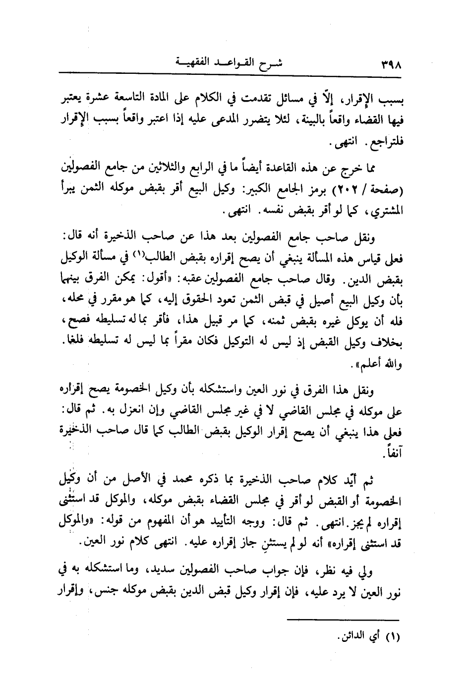 مِمَّا خرج عَن هَذِه الْقَاعِدَة أَيْضا مَا فِي الرَّابِع وَالثَّلَاثِينَ من جَامع الْفُصُولَيْنِ (صفحة / ٢٠٢) برمز الْجَامِع الْكَبِير: وَكيل البيع أقرّ بِقَبض مُوكله الثّمن يبرأ المُشْتَرِي، كَمَا لَو أقرّ بِقَبض نَفسه. انْتهى.