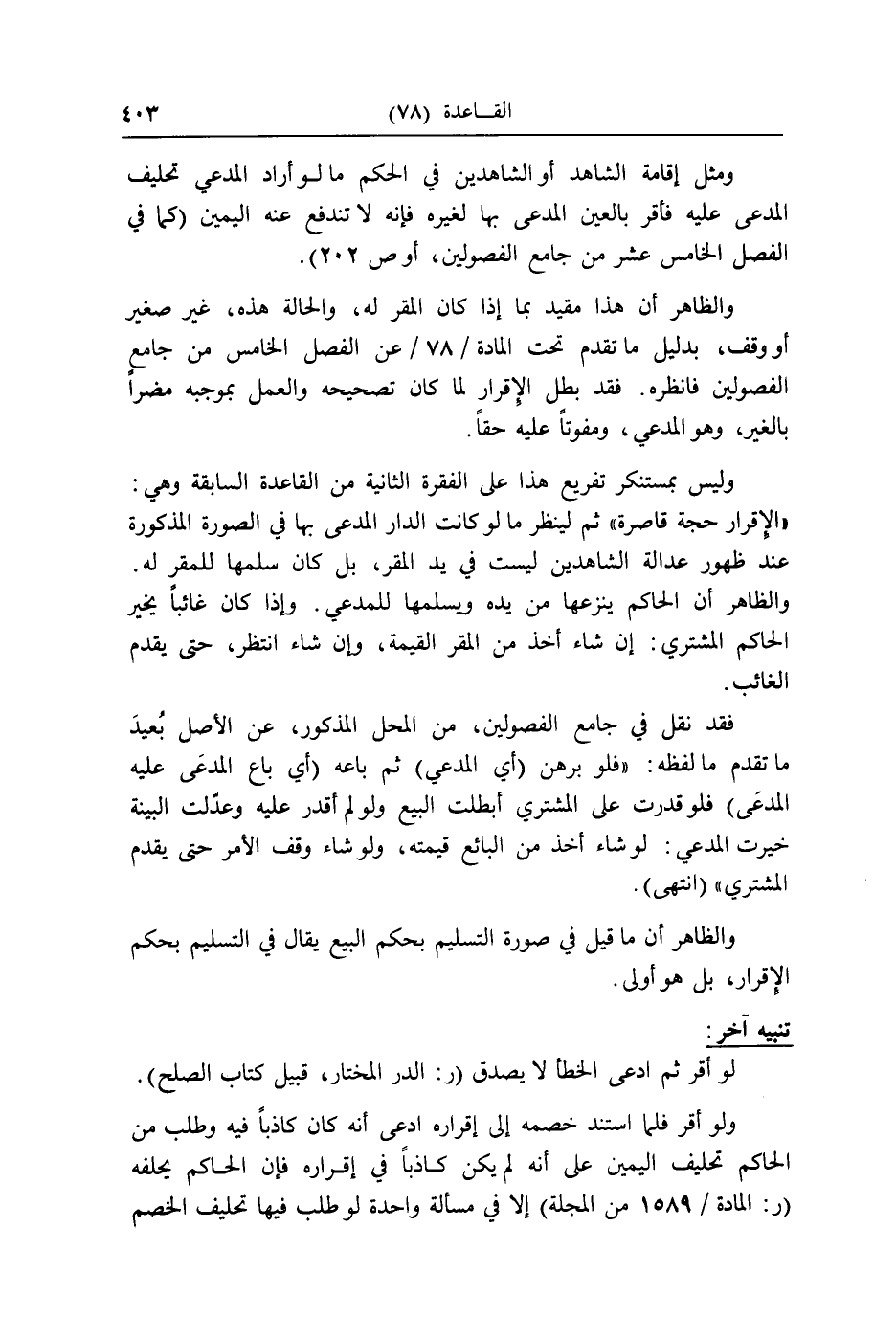وَالظَّاهِر أَن هَذَا مُقَيّد بِمَا إِذا كَانَ الْمقر لَهُ، وَالْحَالة هَذِه، غير صَغِير أَو وقف، بِدَلِيل مَا تقدم تَحت الْمَادَّة / ٧٨ / عَن الْفَصْل الْخَامِس من جَامع الْفُصُولَيْنِ فَانْظُرْهُ. فقد بَطل الْإِقْرَار لما كَانَ تَصْحِيحه وَالْعَمَل بِمُوجبِه مضراً بِالْغَيْر، وَهُوَ الْمُدَّعِي، ومفوتاً عَلَيْهِ حَقًا.