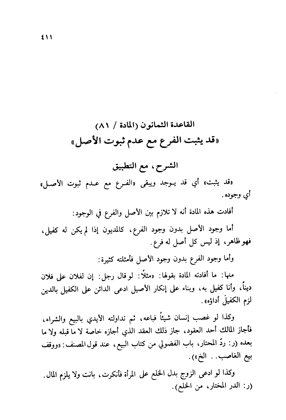 أفادت هَذِه الْمَادَّة أَنه لَا تلازم بَين الأَصْل وَالْفرع فِي الْوُجُود: أما وجود الأَصْل بِدُونِ وجود الْفَرْع، كالمديون إِذا لم يكن لَهُ كَفِيل، فَهُوَ ظَاهر، إِذْ لَيْسَ كل أصل لَهُ فرع.