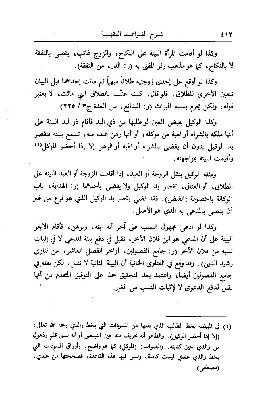 وَمثله الْوَكِيل بِنَقْل الزَّوْجَة أَو العَبْد، إِذا أَقَامَت الزَّوْجَة أَو العَبْد الْبَيِّنَة على الطَّلَاق، أَو الْعتاق، تقصر يَد الْوَكِيل وَلَا يقْضى بِأَحَدِهِمَا (ر: الْهِدَايَة، بَاب الْوكَالَة بِالْخُصُومَةِ وَالْقَبْض) . فقد قضي بقصر يَد الْوَكِيل الَّذِي هُوَ فرع من غير أَن يقْضى بالمدعى بِهِ الَّذِي هُوَ الأَصْل.