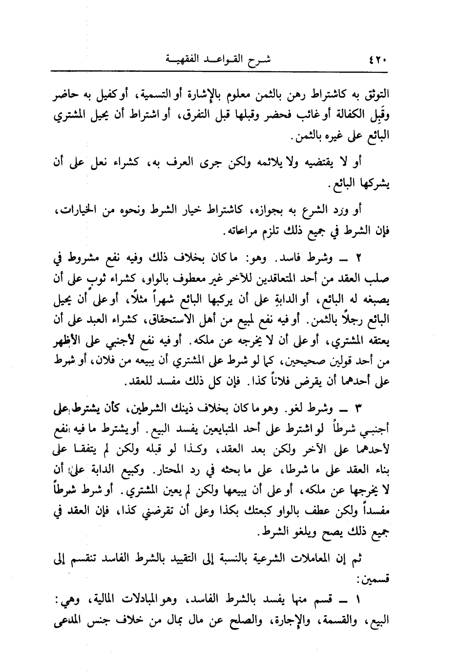 ثمَّ إِن الْمُعَامَلَات الشَّرْعِيَّة بِالنِّسْبَةِ إِلَى التَّقْيِيد بِالشّرطِ الْفَاسِد تَنْقَسِم إِلَى قسمَيْنِ: ١ - قسم مِنْهَا يفْسد بِالشّرطِ الْفَاسِد، وَهُوَ المبادلات الْمَالِيَّة، وَهِي: البيع، وَالْقِسْمَة، وَالْإِجَارَة، وَالصُّلْح عَن مَال بِمَال من خلاف جنس الْمُدعى