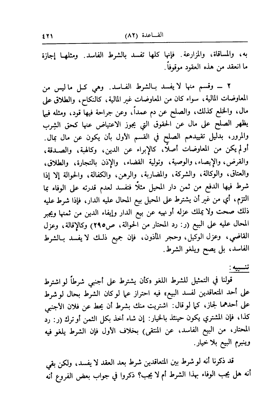 ٢ - وَقسم مِنْهَا لَا يفْسد بِالشّرطِ الْفَاسِد. وَهِي كل مَا لَيْسَ من الْمُعَاوَضَات الْمَالِيَّة، سَوَاء كَانَ من الْمُعَاوَضَات غير الْمَالِيَّة، كَالنِّكَاحِ، وَالطَّلَاق على مَال، وَالْخلْع كَذَلِك، وَالصُّلْح عَن دم عمدا، وَعَن جِرَاحَة فِيهَا قَود، وَمثله فِيمَا يظْهر الصُّلْح على مَال عَن الْحُقُوق الَّتِي يجوز الِاعْتِيَاض عَنْهَا كحق الشّرْب والمرور، بِدَلِيل تقييدهم الصُّلْح فِي الْقسم الأول بِأَن يكون عَن مَال بِمَال. أَو لم يكن من الْمُعَاوَضَات أصلا، كالإبراء عَن الدّين، وكالهبة، وَالصَّدَََقَة، وَالْقَرْض، والإيصاء وَالْوَصِيَّة، وتولية الْقَضَاء، وَالْإِذْن وَالتِّجَارَة، وَالطَّلَاق، وَالْعتاق، وَالْوكَالَة، وَالشَّرِكَة، وَالْمُضَاربَة، وَالرَّهْن، وَالْكَفَالَة، وَالْحوالَة إِلَّا إِذا شَرط فِيهَا الدّفع من ثمن دَار الْمُحِيل مثلا فتفسد لعدم قدرته على الْوَفَاء بِمَا الْتزم، أَي من غير أَن يشْتَرط على الْمُحِيل بيع الْمحَال عَلَيْهِ الدَّار، فَإِذا شَرط عَلَيْهِ ذَلِك صحت وَلَا يملك عَزله أَو نَهْيه عَن بيع الدَّار وإيفاء الدّين من ثمنهَا وَيجْبر الْمحَال عَلَيْهِ على البيع (ر: رد الْمُحْتَار من الْحِوَالَة، ص ٢٩٥) وكالإقالة، وعزل القَاضِي، وعزل الْوَكِيل، وَحجر الْمَأْذُون، فَإِن جَمِيع ذَلِك لَا يفْسد بِالشّرطِ الْفَاسِد، بل يَصح وَيَلْغُو الشَّرْط.