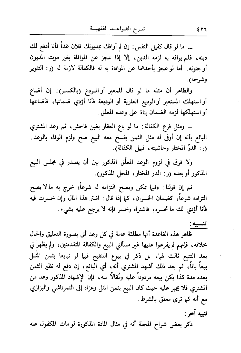 ظَاهر هَذِه الْقَاعِدَة أَنَّهَا مُطلقَة عَامَّة فِي كل وعد أَتَى بِصُورَة التَّعْلِيق وَالْحَال خِلَافه، فَإِنَّهُم لم يفرعوا عَلَيْهَا غير مَسْأَلَتي البيع وَالْكَفَالَة المتقدمتين، وَلم يظْهر لي بعد التتبع ثَالِث لَهما، بل ذكر فِي بُيُوع التَّنْقِيح فِيمَا لَو تبَايعا بِثمن الْمثل بيعا باتاً، ثمَّ بعد ذَلِك أشهد المُشْتَرِي أَنه، أَي البَائِع، إِن دفع لَهُ نَظِير الثّمن بعده مُدَّة كَذَا يكن بَيْعه مردوداً عَلَيْهِ ومقالاً مِنْهُ، فَإِن الْإِشْهَاد الْمَذْكُور وعد من المُشْتَرِي فَلَا يجْبر عَلَيْهِ حَيْثُ كَانَ البيع بِثمن الْمثل وَعَزاهُ إِلَى التُّمُرْتَاشِيّ والبزازي مَعَ أَنه كَمَا ترى مُعَلّق بِالشّرطِ.
