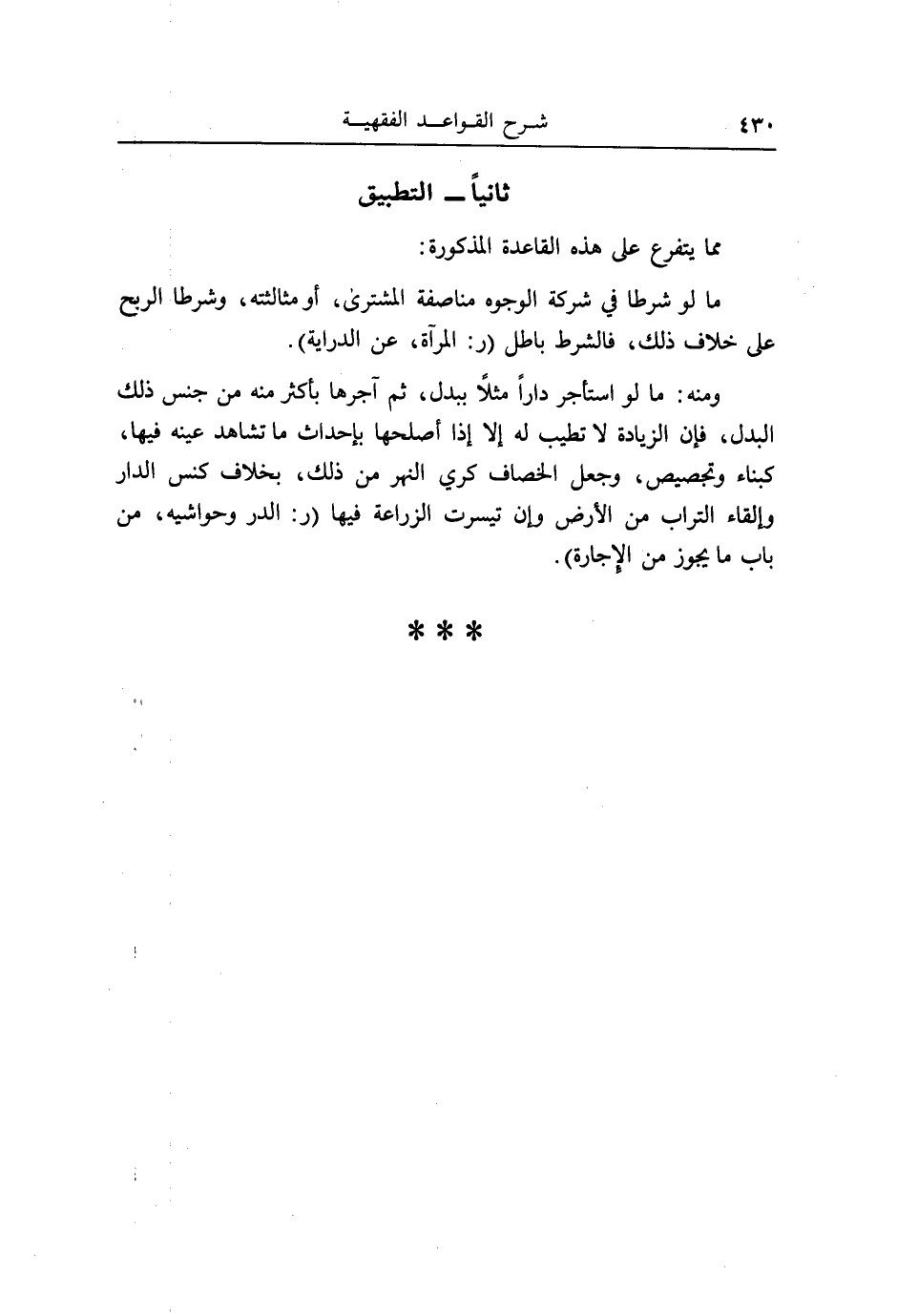 مِمَّا يتَفَرَّع على هَذِه الْقَاعِدَة الْمَذْكُورَة: مَا لَو شرطا فِي شركَة الْوُجُوه مُنَاصَفَة الْمُشْتَرى، أَو مثالثته، وشرطا الرِّبْح على خلاف ذَلِك، فَالشَّرْط بَاطِل (ر: الْمرْآة، عَن الدِّرَايَة) .